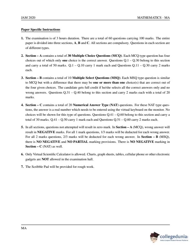 IIT JAM 2020 Mathematics (MA) Question paper with answer key pdf conducted on February 9 in Afternoon Session 2:30 PM to 5:30 PM is available for download. The exam was successfully organized by IIT Kanpur. The question paper comprised a total of 60 questions divided among 3 sections.
