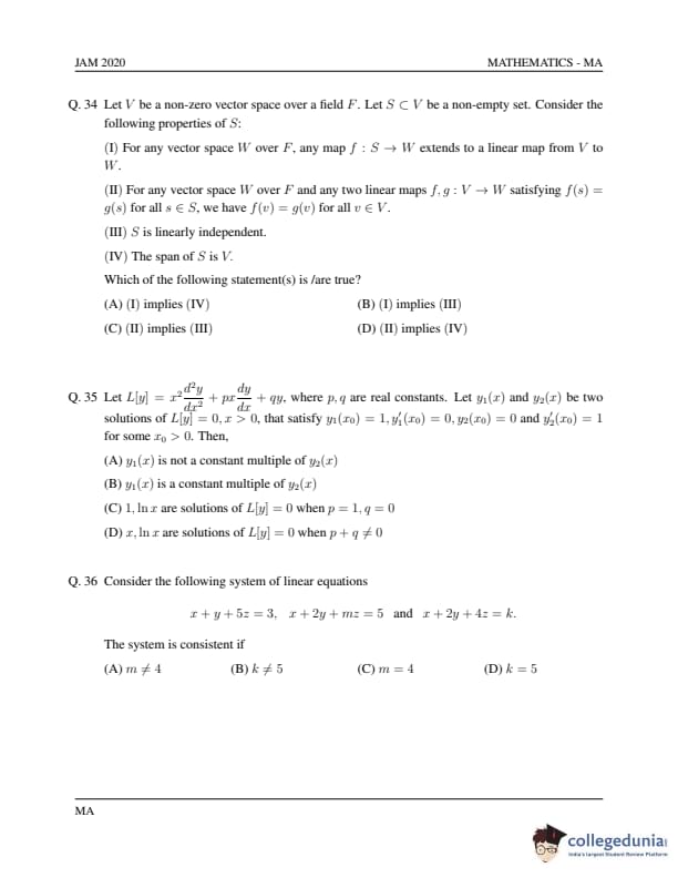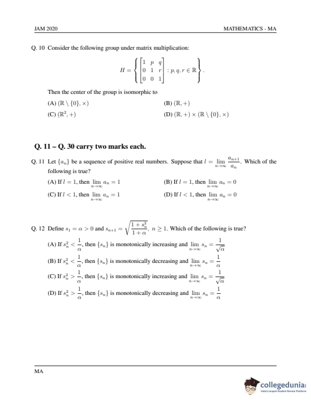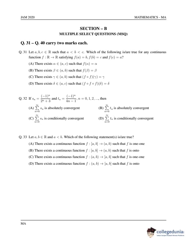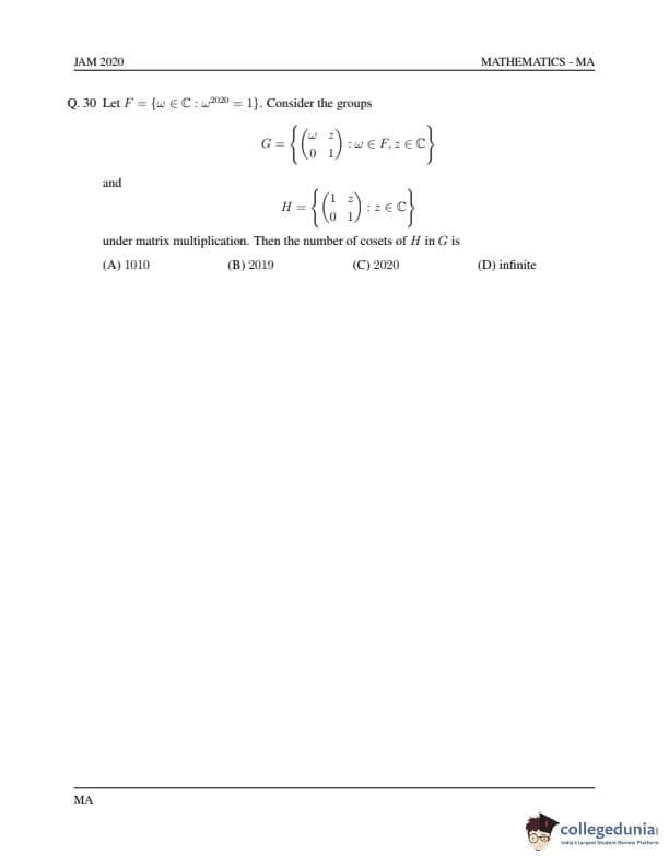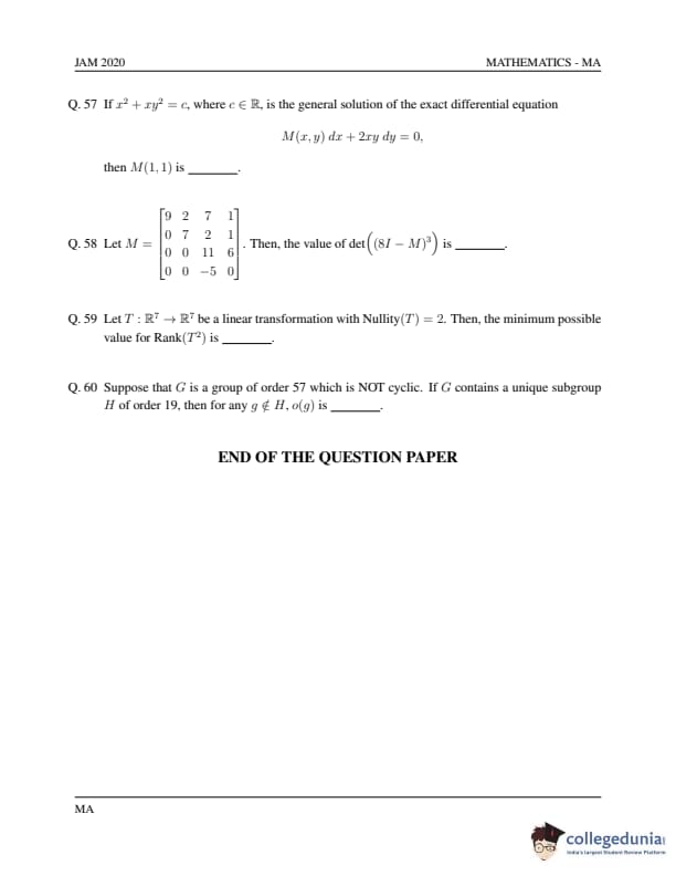IIT JAM 2020 Mathematics (MA) Question Paper with Answer Key PDFs Afternoon Session