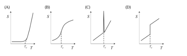 Among the given graphs, only Graph (D) shows a sudden jump in entropy at \(T_c\), indicating a discontinuous change.