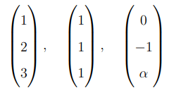 be eigenvectors of \(M\) corresponding to three distinct eigenvalues. Then, which of the following is NOT a possible value of \(\alpha\)?