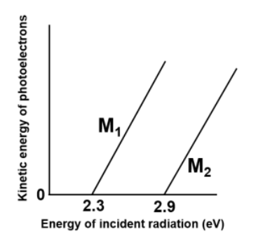 The following diagram shows the kinetic energy of the ejected photoelectrons against the energy of incident radiation for two metal surfaces M1 and M2. If the energy of the incident radiation on M1 is equal to the work function of M2, the de Broglie wavelength of the ejected photoelectron is ____ nm.
