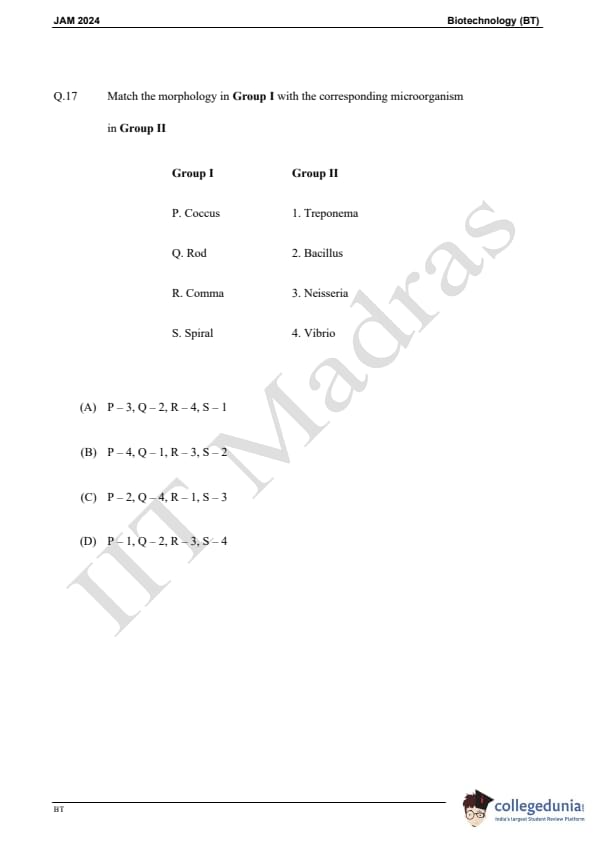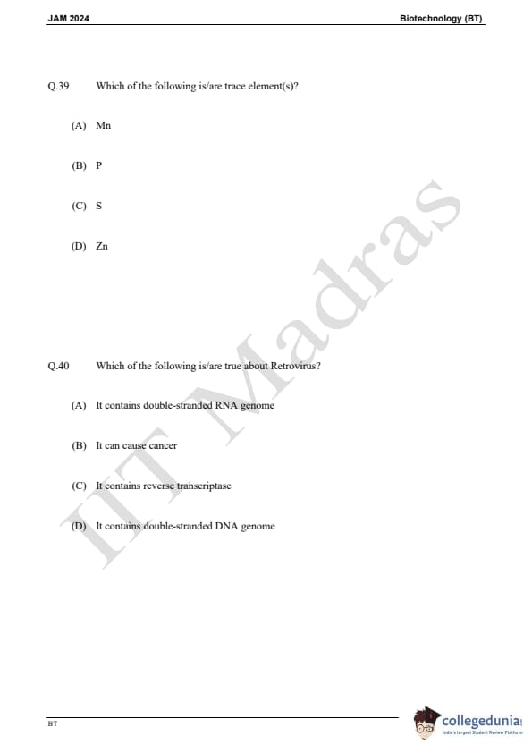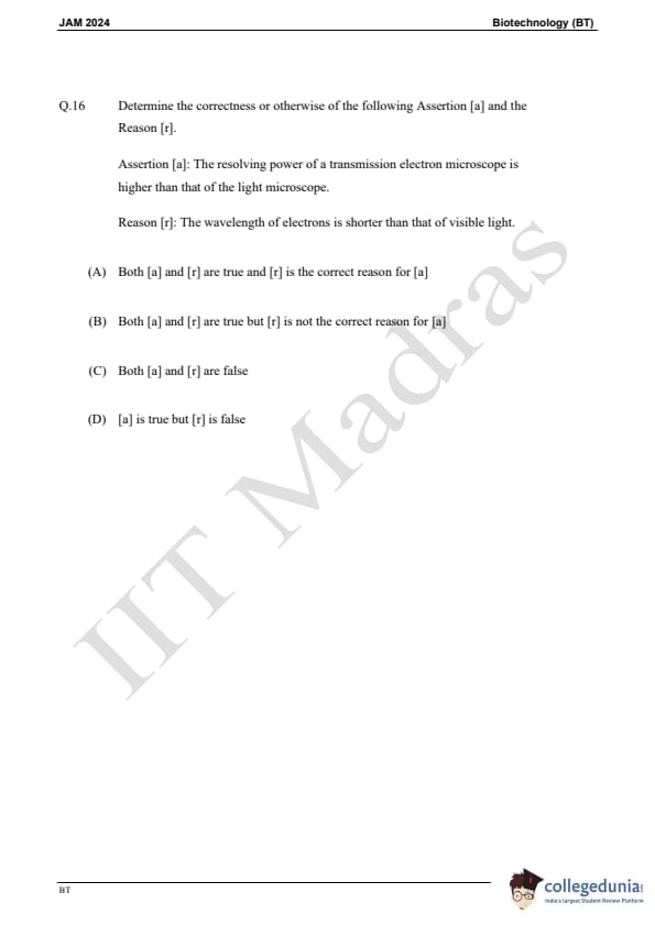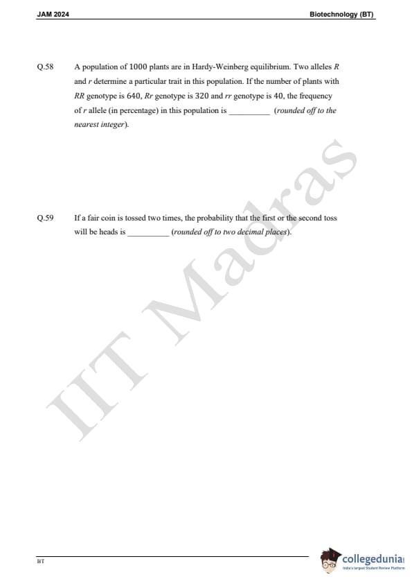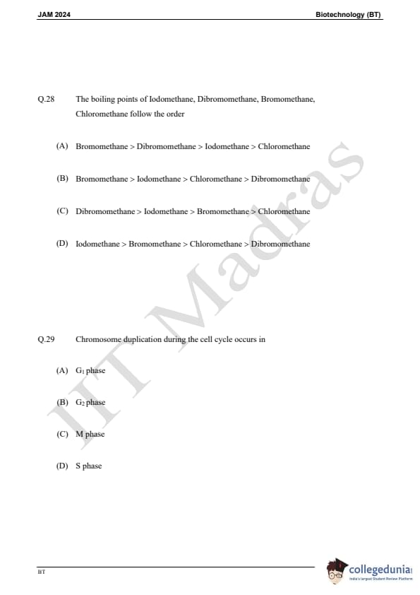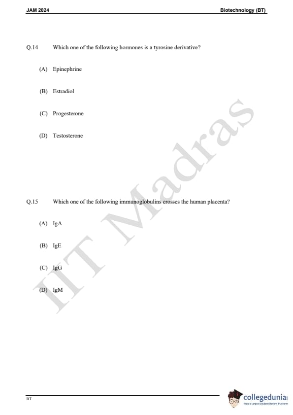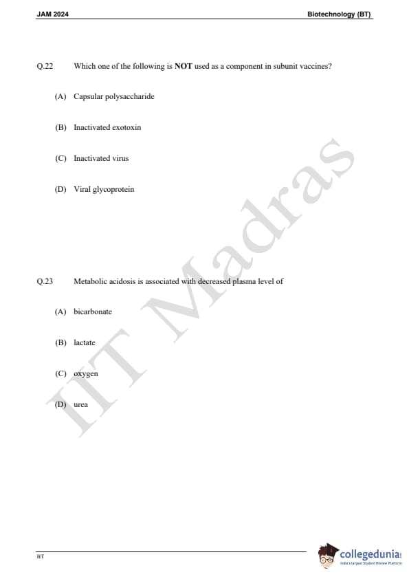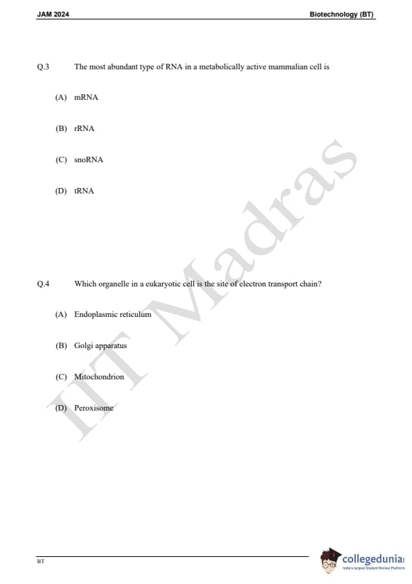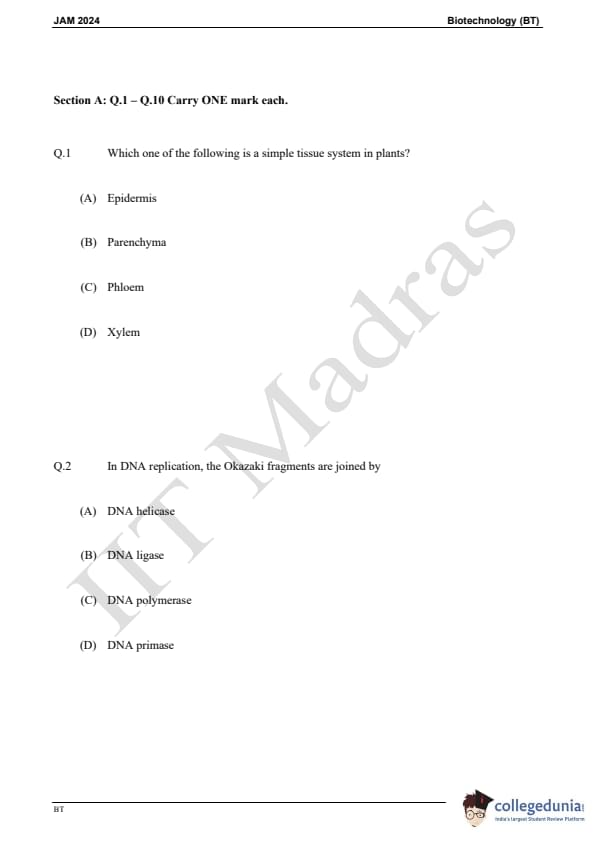IIT JAM 2024 Biotechnology (BT) Question Paper with Answer Key pdf is available for download. IIT JAM 2024 BT exam was conducted by IIT Madras in shift 2 on February 11, 2024. In terms of difficulty level, IIT JAM 2024 Biotechnology (BT) paper was of moderate level. IIT JAM 2024 question paper for BT comprised a total of 60 questions.