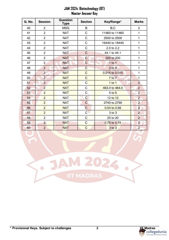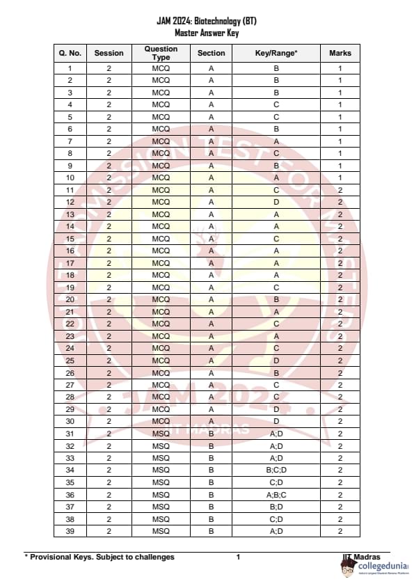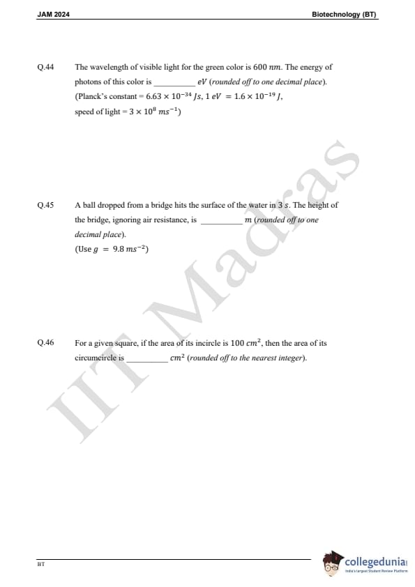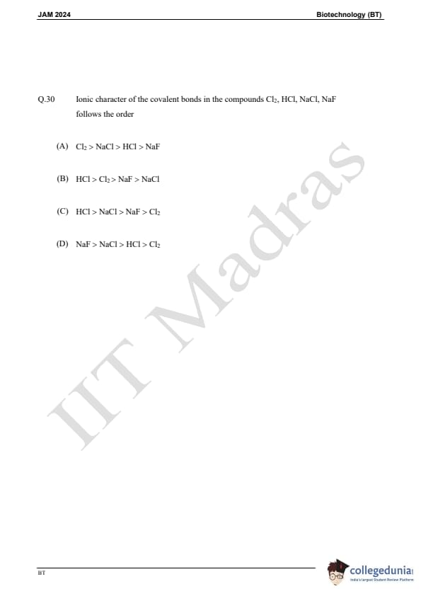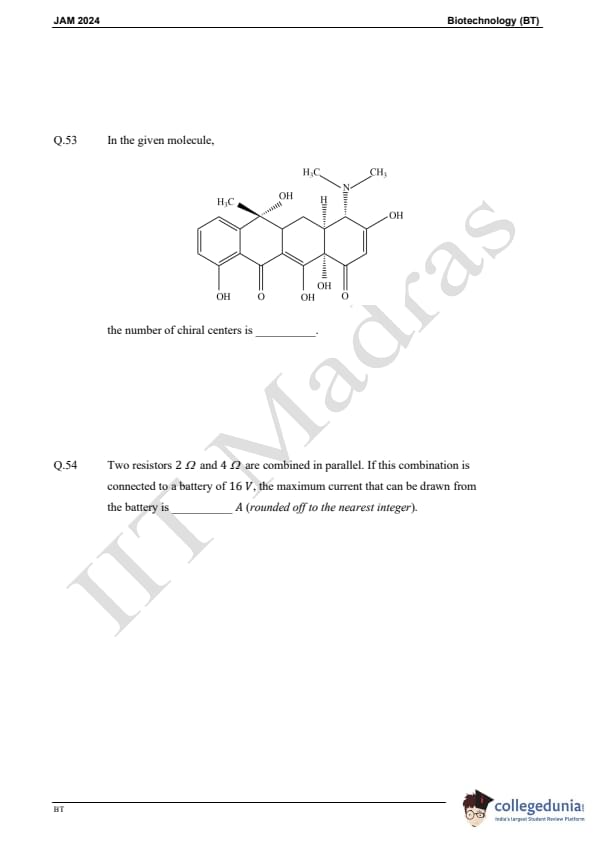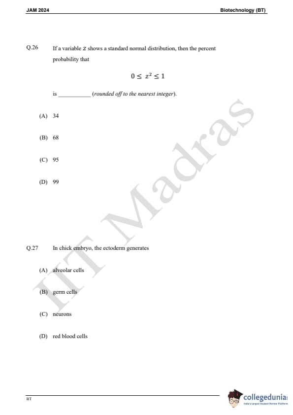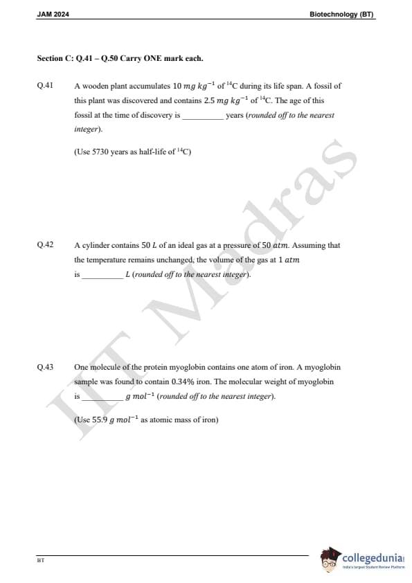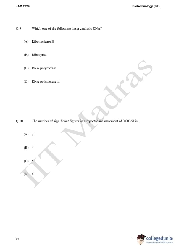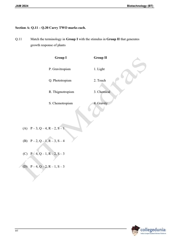 IIT JAM 2024 Biotechnology (BT) Question Paper with Answer Key pdf is available for download. IIT JAM 2024 BT exam was conducted by IIT Madras in shift 2 on February 11, 2024. In terms of difficulty level, IIT JAM 2024 Biotechnology (BT) paper was of moderate level. IIT JAM 2024 question paper for BT comprised a total of 60 questions.