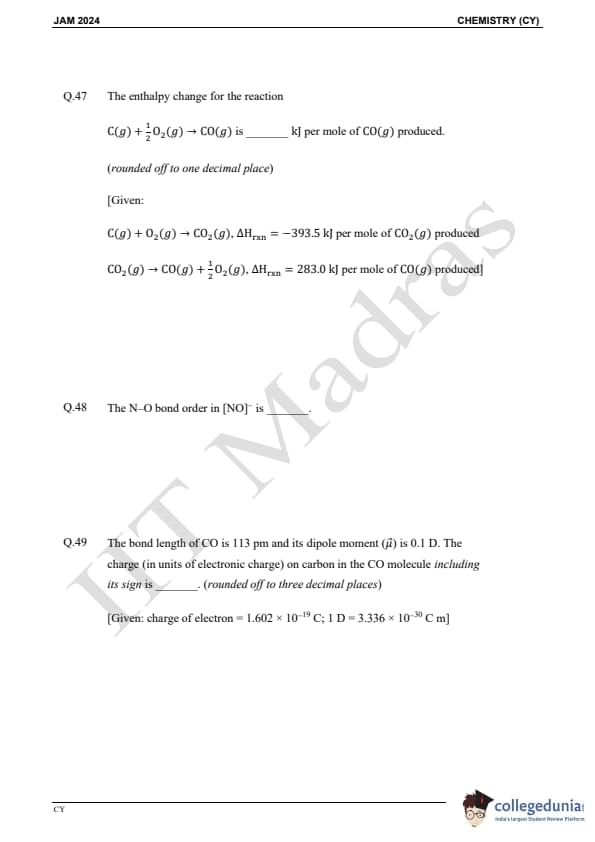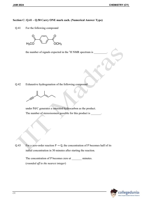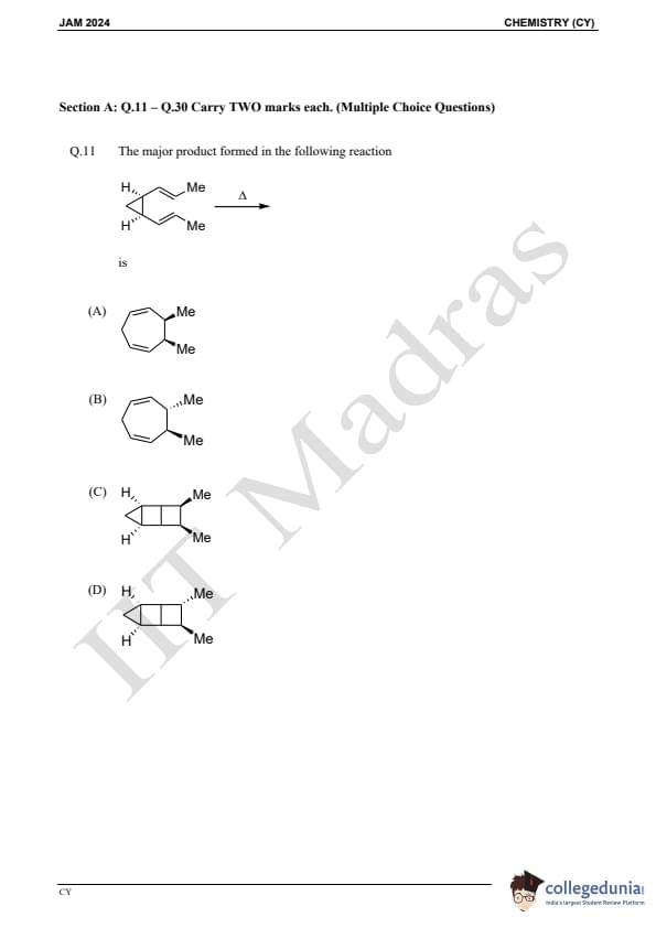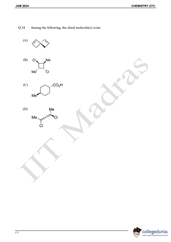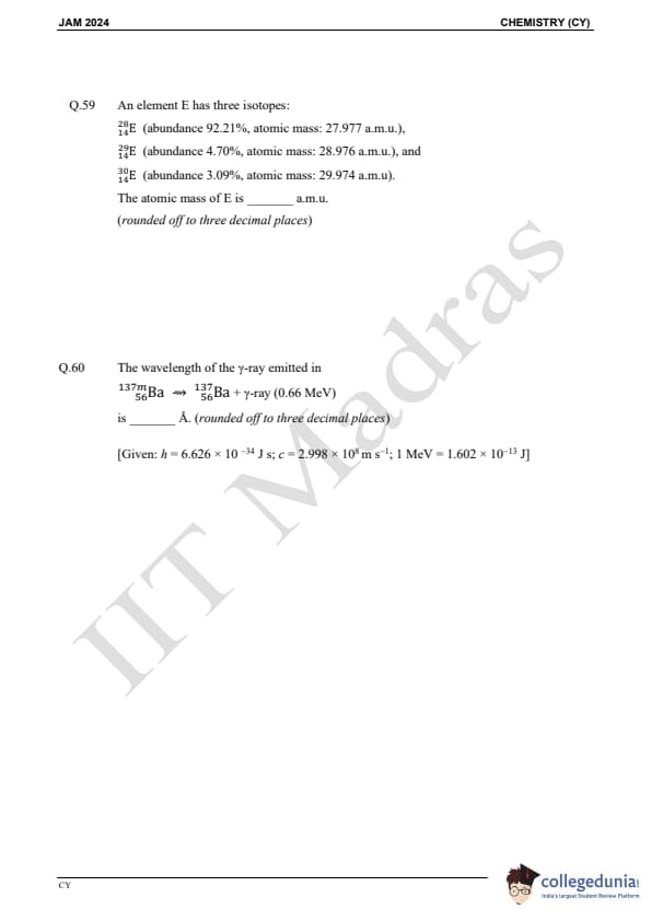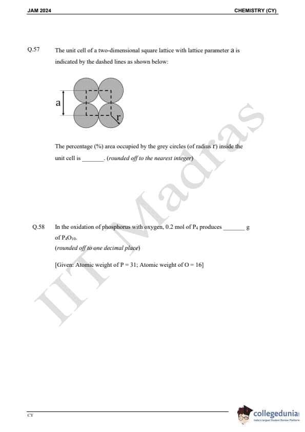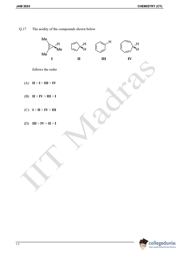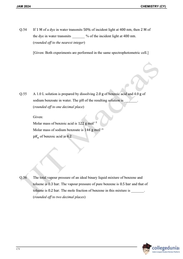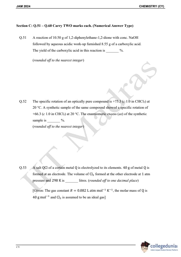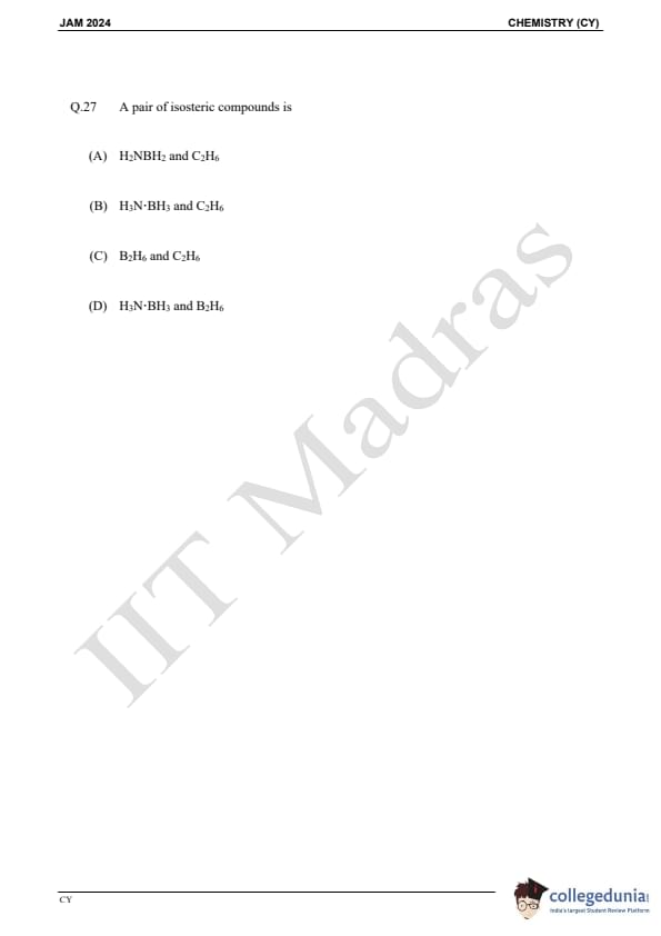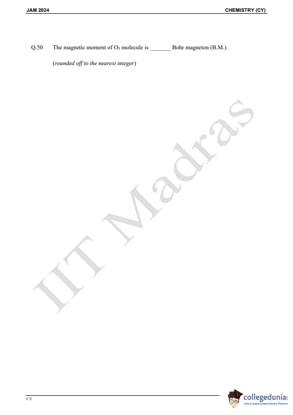 IIT JAM 2024 Chemistry (CY) Question Paper with Answer Key pdf is available for download. IIT JAM 2024 CY exam was conducted by IIT Madras in shift 1 on February 11, 2024. In terms of difficulty level, IIT JAM 2024 Chemistry (CY) paper was of easy to moderate. IIT JAM 2024 question paper for CY comprised a total of 60 questions.