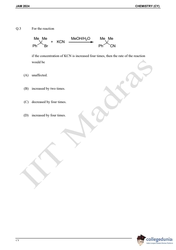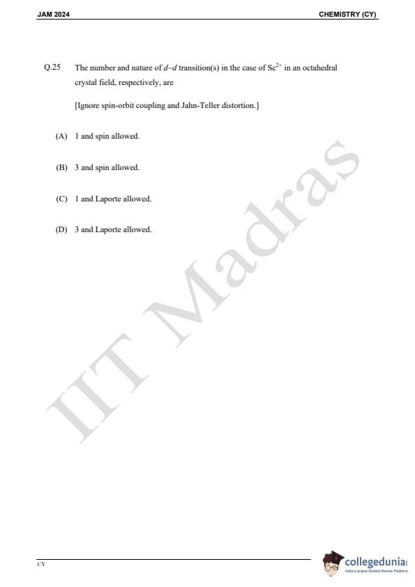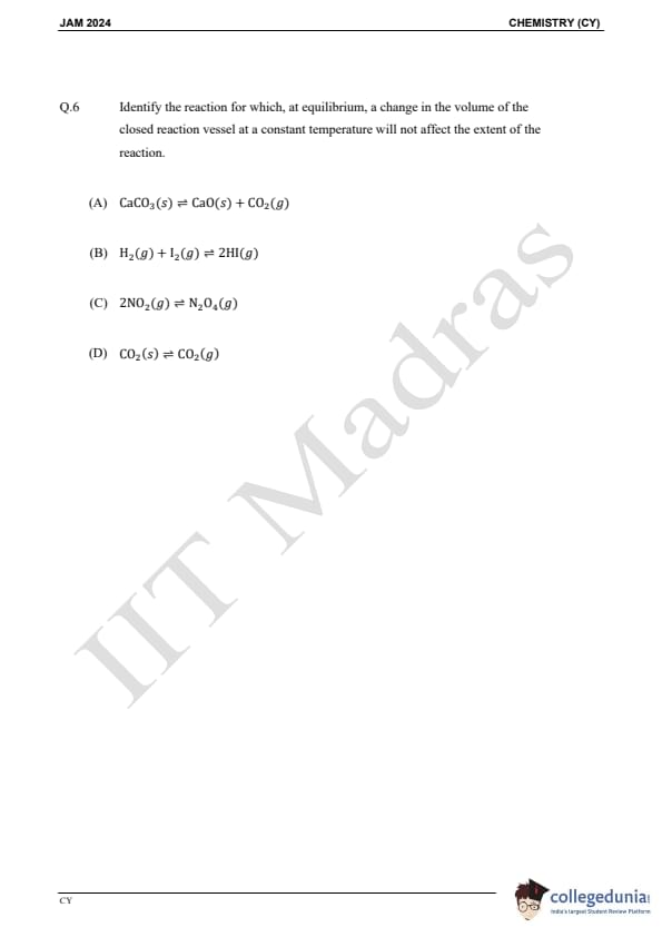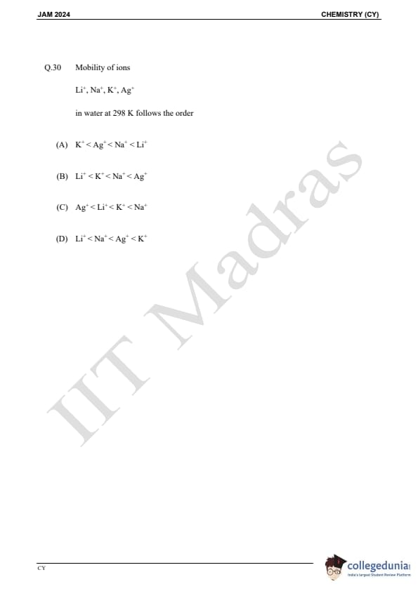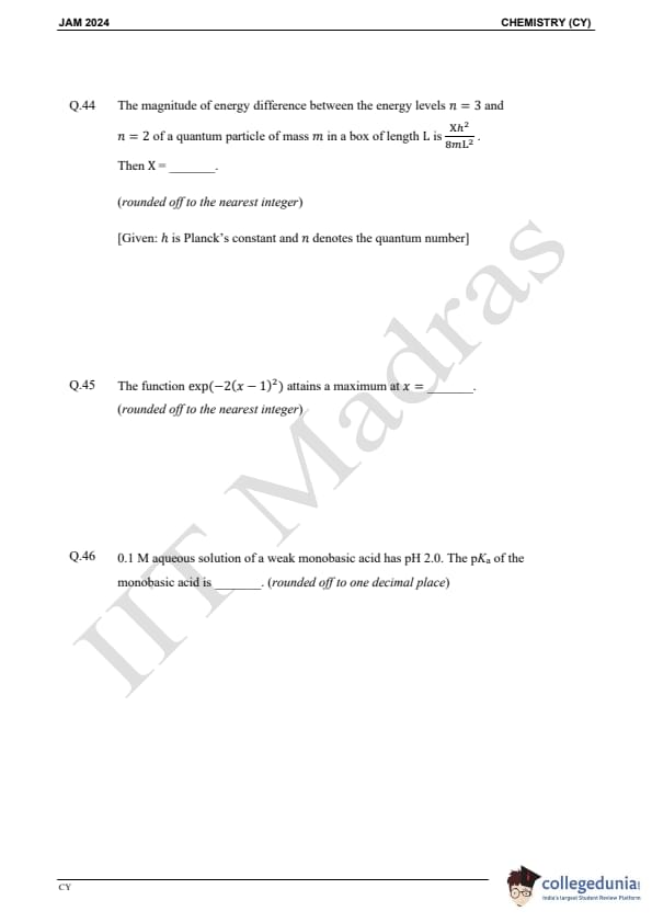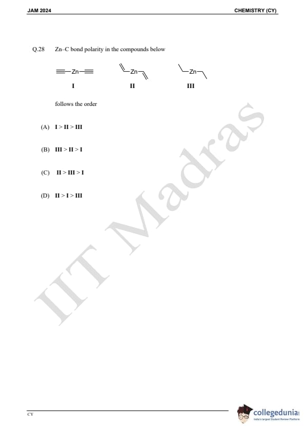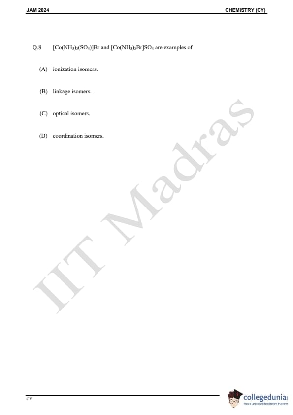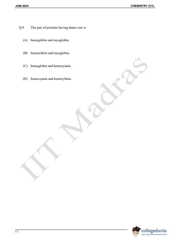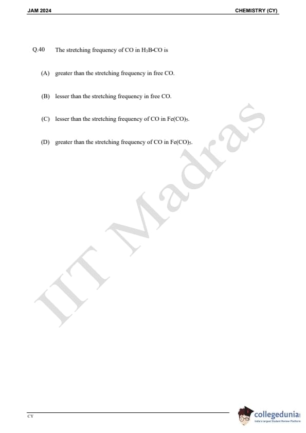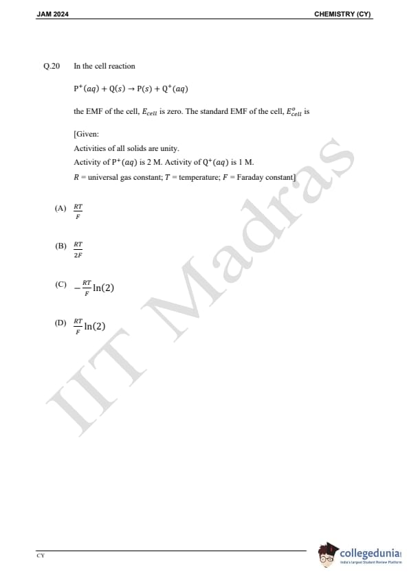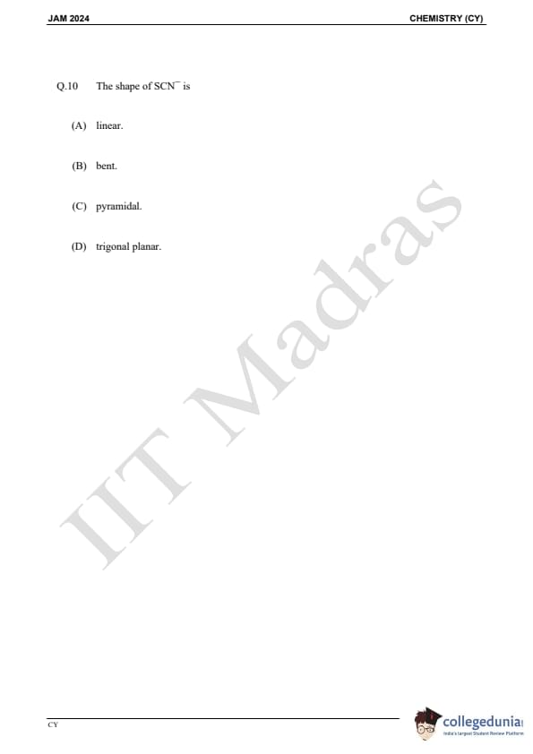 IIT JAM 2024 Chemistry (CY) Question Paper with Answer Key pdf is available for download. IIT JAM 2024 CY exam was conducted by IIT Madras in shift 1 on February 11, 2024. In terms of difficulty level, IIT JAM 2024 Chemistry (CY) paper was of easy to moderate. IIT JAM 2024 question paper for CY comprised a total of 60 questions.