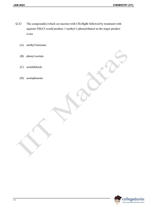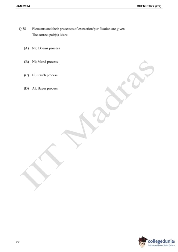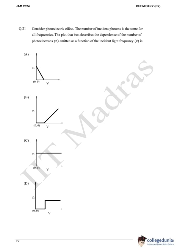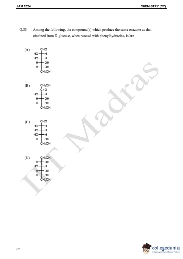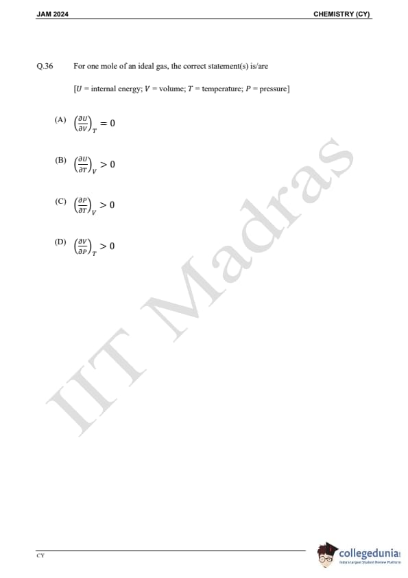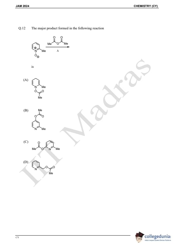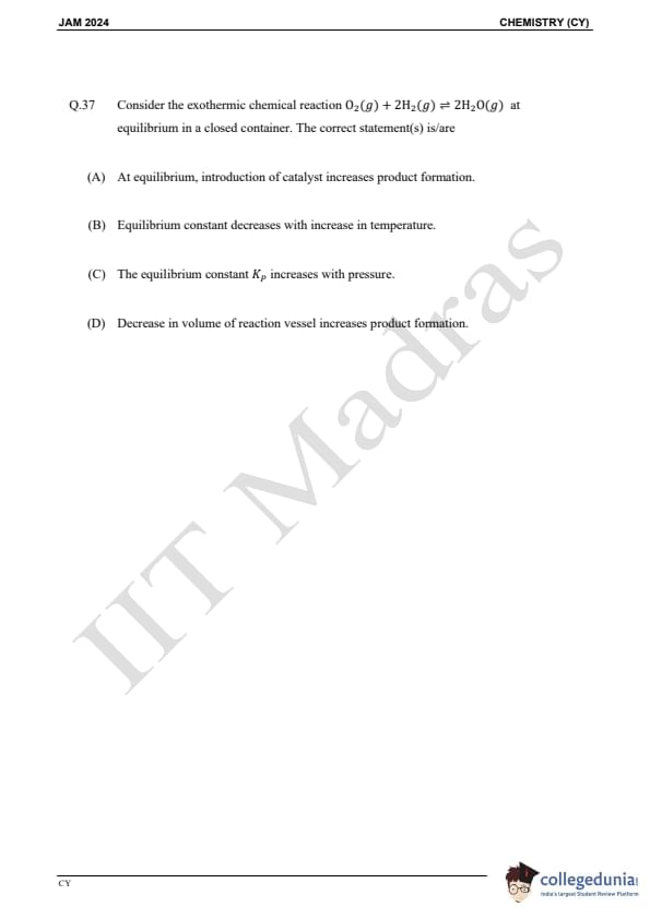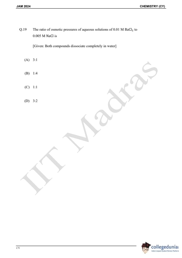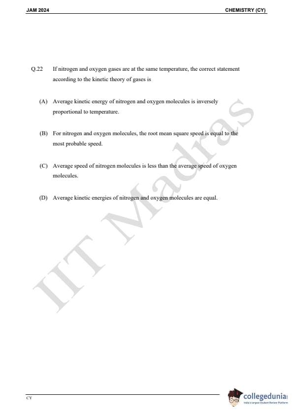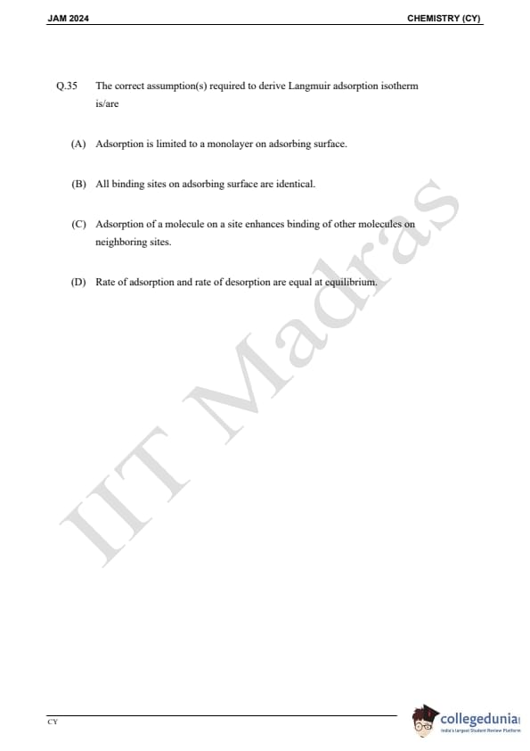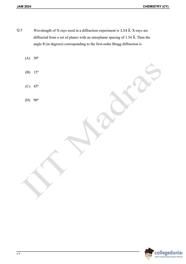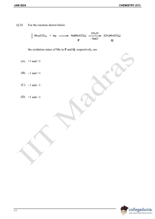 IIT JAM 2024 Chemistry (CY) Question Paper with Answer Key pdf is available for download. IIT JAM 2024 CY exam was conducted by IIT Madras in shift 1 on February 11, 2024. In terms of difficulty level, IIT JAM 2024 Chemistry (CY) paper was of easy to moderate. IIT JAM 2024 question paper for CY comprised a total of 60 questions.