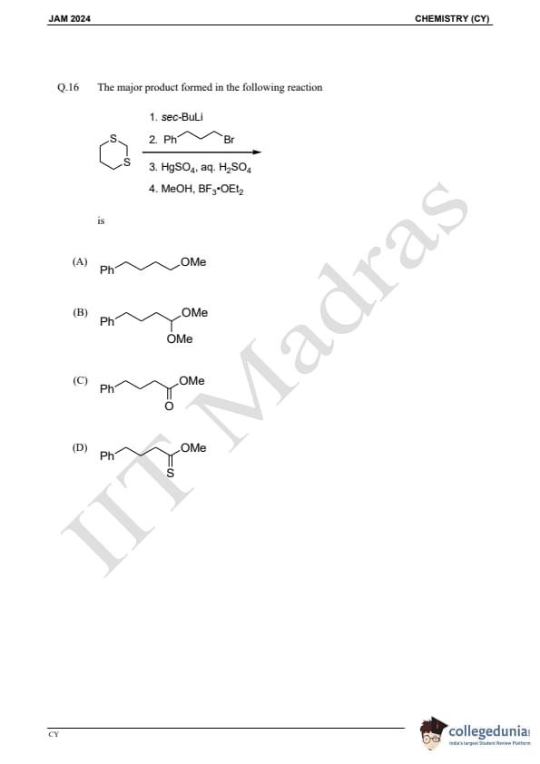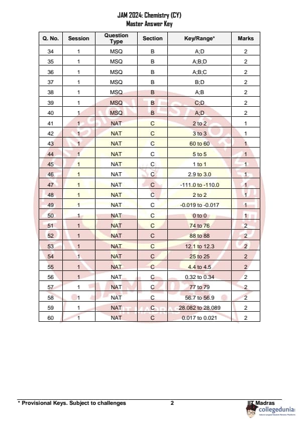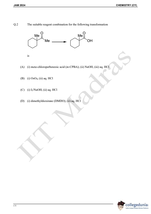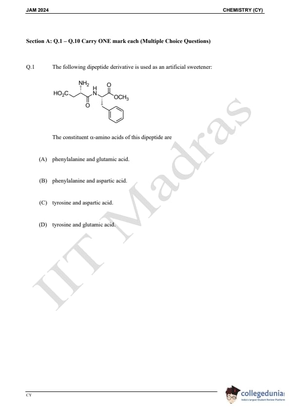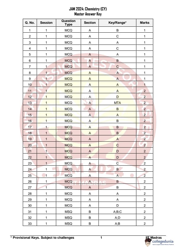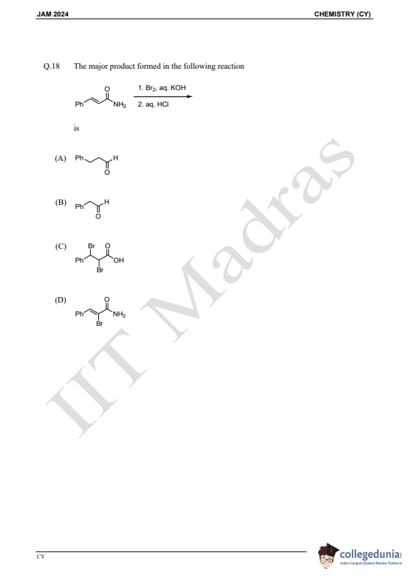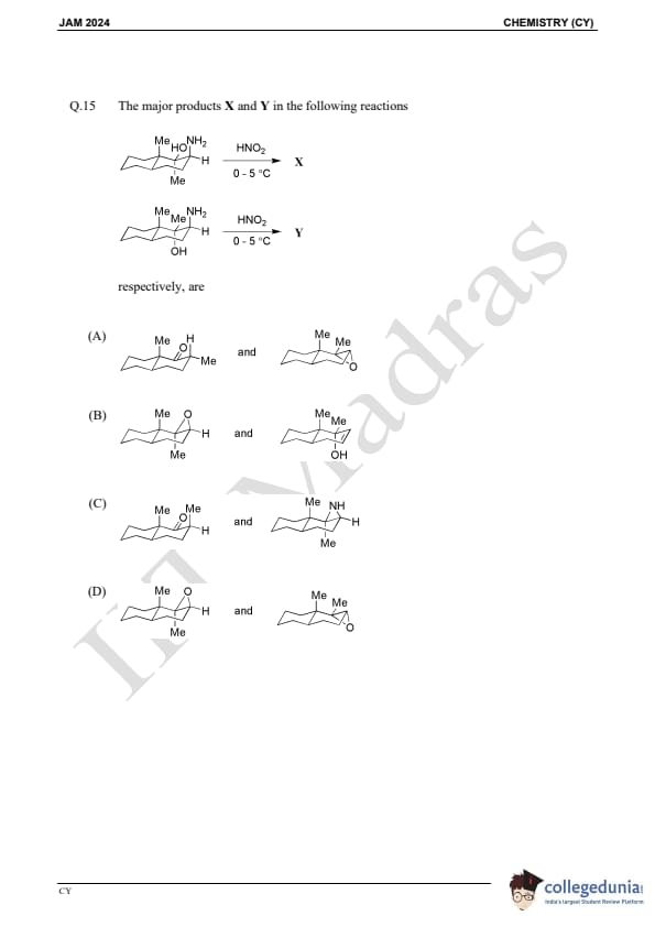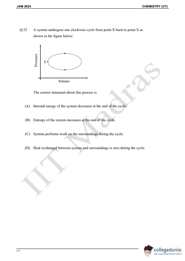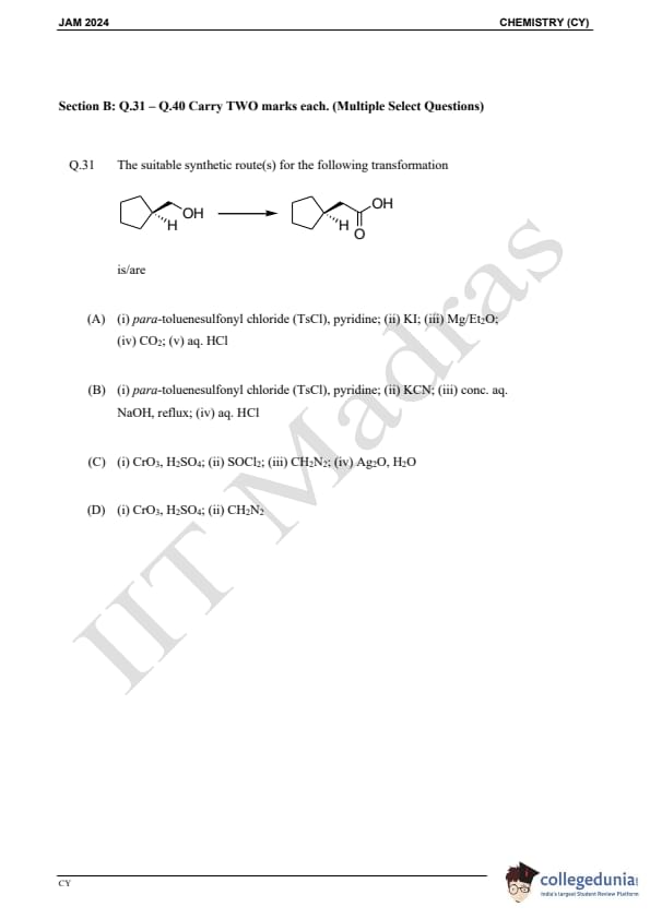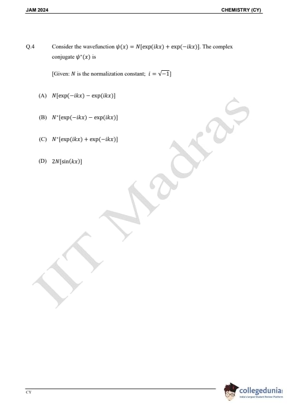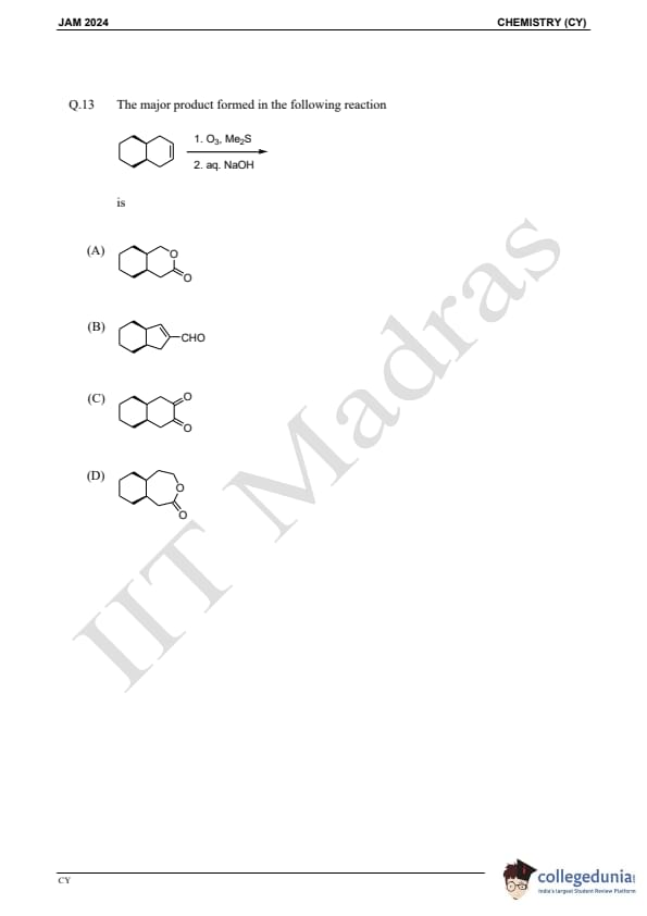 IIT JAM 2024 Chemistry (CY) Question Paper with Answer Key pdf is available for download. IIT JAM 2024 CY exam was conducted by IIT Madras in shift 1 on February 11, 2024. In terms of difficulty level, IIT JAM 2024 Chemistry (CY) paper was of easy to moderate. IIT JAM 2024 question paper for CY comprised a total of 60 questions.