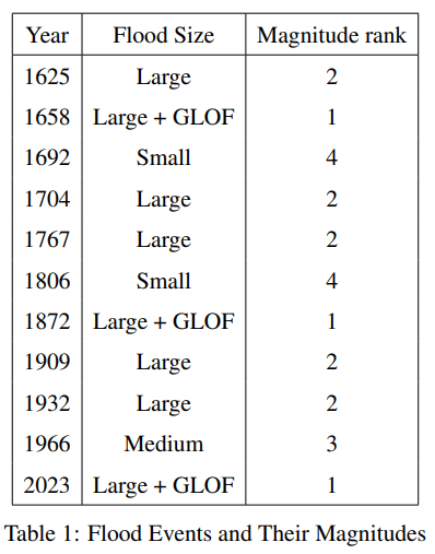 The data tabulated below are for flooding events in the last 400 years. The probability of a large flood accompanied by a glacial lake outburst flood (GLOF) in 2025 is ........... \(\times 10^{-3}\). (Round off to one decimal place)