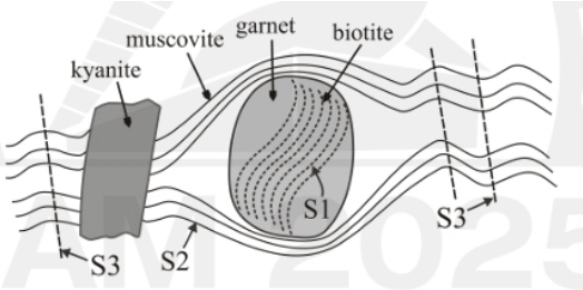 The schematic diagram given below shows textual relationship among garnet, muscovite, biotite and kyanite in a metapelite. Biotite defines S1 foliation and muscovite defines S2 and S3 foliations. S1, S2, and S3 fabrics were developed during distinct deformation events D1, D2, and D3, respectively. Which one of the following represents the pre-D3 mineral assemblage?