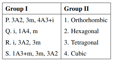 Match the symmetry elements in Group I with the corresponding crystal system in Group II.