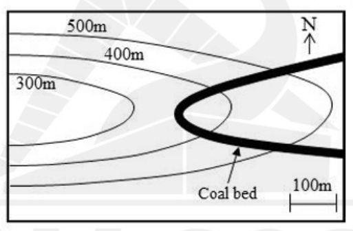 The following map shows an outcrop of a coal bed that intersects the elevation contours. Which one of the following statements is CORRECT?
