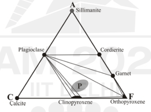 The shaded region (P) in the given ACF diagram represents the compositional range of mafic rocks that have undergone granulite facies metamorphism. Which of the following equilibrium mineral assemblages is/are identified in these mafic rocks?