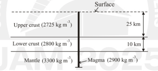 A magma having density of 2900 kg m\(^-3\) just reaches the surface through a two-layered crust as shown in the figure below. Assuming isostatic equilibrium, its depth of melting is .......... km. (Round off to one decimal place)