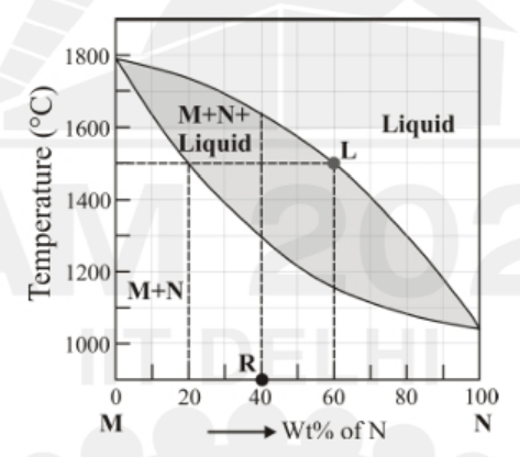 The isobaric temperature-composition (T–X) phase diagram given below shows the phase relation between components M and N. The equilibrium melting undergone by the rock R to generate the liquid of composition L is .............. % (In integer)