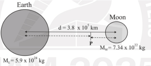 A satellite launching vehicle is carrying a lander for Moon mapping. As shown in the figure below, P is the position where the gravitational forces exerted by Earth and Moon on the vehicle balance out. The distance \( P \) from the center of the Earth is ........... \( \times 10^5 \) km. (Round off to two decimal places)