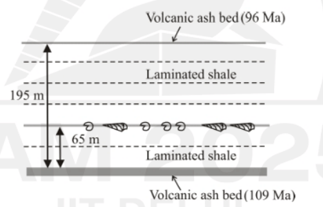 A well-developed succession of laminated shale is bound by two volcanic ash beds that were precisely dated as shown in the schematic diagram given below. Assuming a constant sedimentation rate, the age of the fossiliferous limestone bed 65 m above the basal volcanic ash bed is ............ Ma. (Round off to nearest integer)