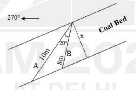 Two boreholes A and B, both inclined towards 270°, penetrate a dipping coal bed at the same point and pass through it entirely in the sub-surface as shown in the figure below. The bed dips towards 270°. The thickness of the coal bed, measured along the borehole A is 10 m and along borehole B is 8 m. The angle between the two boreholes is 20°. The orthogonal thickness \( x \) of the coal bed is ........ m. (Round off to one decimal place)