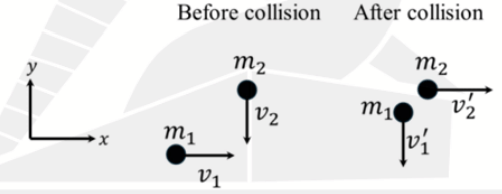 Two point-particles having masses \(m_1\) and \(m_2\) approach each other in perpendicular directions with speeds \(v_1\) and \(v_2\), respectively, as shown in the figure below. After an elastic collision, they move away from each other in perpendicular directions with speeds \(v'_1\) and \(v'_2\), respectively.