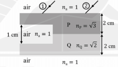 Two parallel light rays 1 and 2 are incident from air on a system consisting of media P, Q, and air, as shown in the figure below. The incident angle is 45°. Ray 1 passes through medium P, air and medium Q and ray passes through media P and Q before leaving the system. After passing through the system, the angular deviation (in radians) between the two rays is