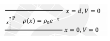 Consider a parallel plate capacitor (distance between the plates d, and permittivity \(\epsilon_0\)) as shown in the figure below. The space charge density between the plates varies as \(\rho(x) = \rho_0 e^{-x}\). Voltage \(V = 0\) both at \(x = 0\) and \(x = d\). The voltage \(V(x)\) at point P between the plates is