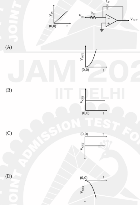 If the input voltage waveform \(V_{IN}\) is a ramp function (as shown in the \(V_{IN} - t\) plot below), then the output wave form (\(V_{OUT}\)) for the given circuit diagram having an ideal operational amplifier (Op-Amp) is