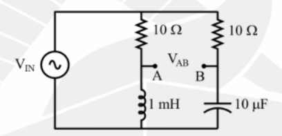 In the circuit given below, the frequency of the input voltage \(V_{IN}\) is \(\omega = 10^4\) rad/s. The output voltage \(V_{AB}\) leads \(V_{IN}\) by
