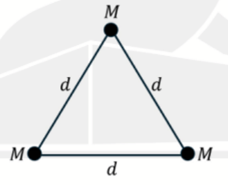 Three particles of equal mass M, interacting via gravity, lie on the vertices of an equilateral triangle of side d, as shown in the figure below. The whole system is rotating with an angular velocity \(\omega\) about an axis perpendicular to the plane of the system and passing through the center of mass. The value of \(\omega\), for which the distance between the masses remains d, is