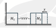 Two masses, \(M_1\) and \(M_2\), are connected through a massless spring of spring constant k, as shown in the figure below. The mass \(M_1\) is at rest against a rigid wall. Both \(M_1\) and \(M_2\) are on a frictionless surface. The mass \(M_2\) is pushed towards \(M_1\) by a distance x from its equilibrium position and then released. After \(M_1\) leaves the wall, the speed of the center of mass of the composite system is