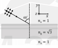 An unpolarized light ray passing through air (refractive index \(n_a = 1\)) is incident on a glass slab (refractive index \(n_g = \sqrt{3}\)) at an angle of 60°, as shown in the figure below. The amplitude of the in-plane (x-y) electric field component of the incident light is 4 V/m and amplitude of the out of plane (z) electric field component is 3 V/m. After passing through the glass slab, the electric field amplitude (in V/m) of the light is