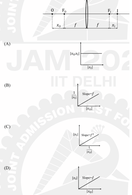 For a thin convex lens of focal length f, the image of an object at O is formed at I, as shown in the figure below. The distances of object and image from the two focal points (\(F_O\) and \(F_I\)) are \(x_O\) and \(x_I\), respectively. Which of the following graphs correctly represent(s) the variation of the quantities shown in the figure?