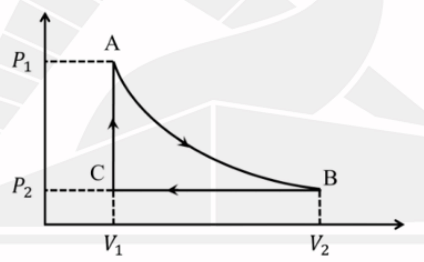 An ideal mono-atomic gas is expanded adiabatically from A to B. It is then compressed in an isobaric process from B to C. Finally, the pressure is increased in an isochoric process from C to A. The cyclic process is shown in the figure below. For this system, which of the following is(are) correct?