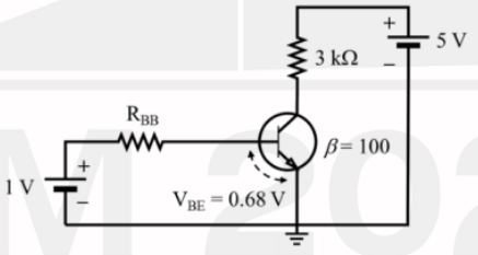 A NPN bipolar junction transistor (BJT) is connected in common emitter (CE) configuration as shown in the circuit diagram below. The amplifier is operating in the saturation regime. The collector-emitter saturation voltage (\(V_{CE,sat}\)) is 0.2 V. The current gain \(\beta = 100\). The maximum value of base resistance \(R_{BB}\) is __________ k\(\Omega\). (in integer)