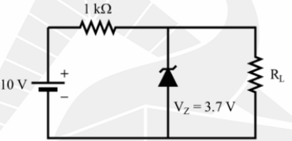 For a Zener diode as shown in the circuit diagram below, the Zener voltage \(V_Z\) is 3.7 V. For a load resistance (\(R_L\)) of 1 k\(\Omega\), a current \(I_1\) flows through the load. If \(R_L\) is decreased to 500 \(\Omega\), the current changes to \(I_2\). The ratio \(\frac{I_2}{I_1}\) is __________. (up to two decimal places)
