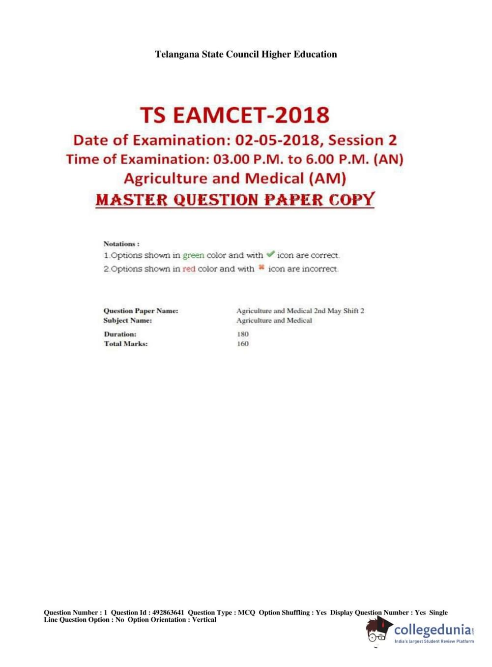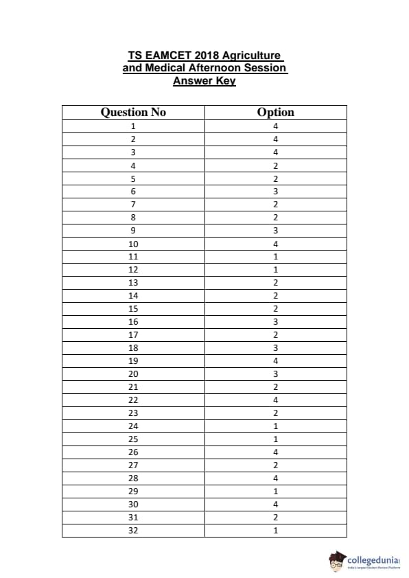 | TS EAMCET 2018 Agriculture and Medical Question Paper PDF | TS EAMCET 2018 Agriculture and Medical Answer Key PDF |