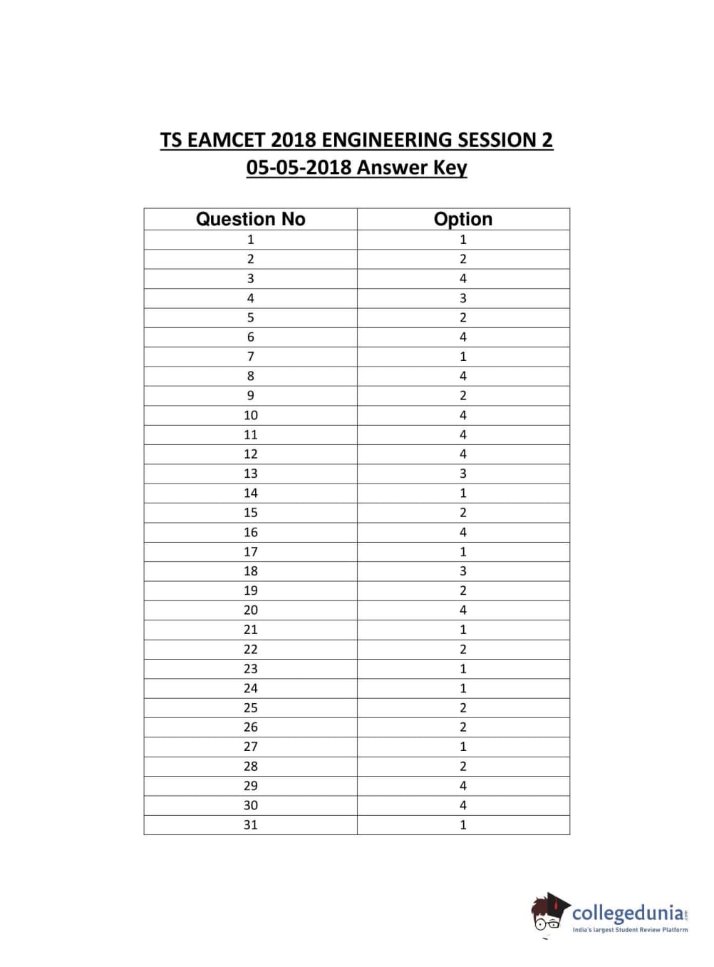 | TS EAMCET 2018 Engineering Question Paper PDF | TS EAMCET 2018 Engineering Answer Key PDF |