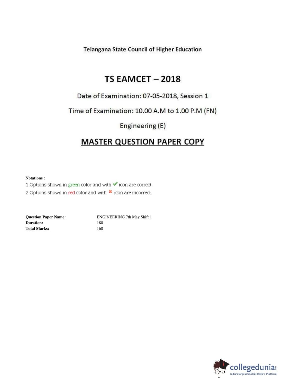 TS EAMCET 2018 Engineering Question paper with answer key pdf conducted on May 7 in Forenoon Session 10 AM to 1 PM is available for download. The exam was successfully organized by Jawaharlal Nehru Technological University, Hyderabad (JNTUH). The question paper comprised a total of 160 questions divided among 3 sections.