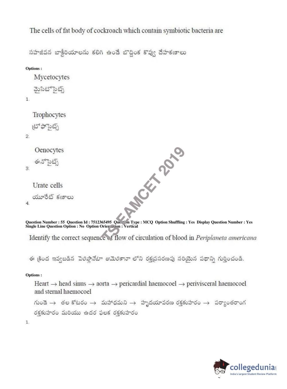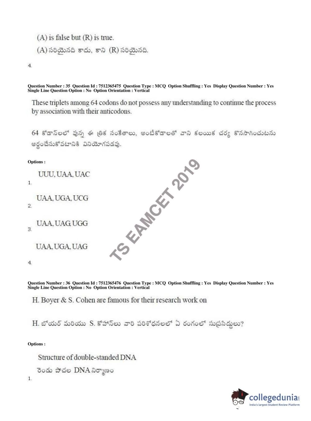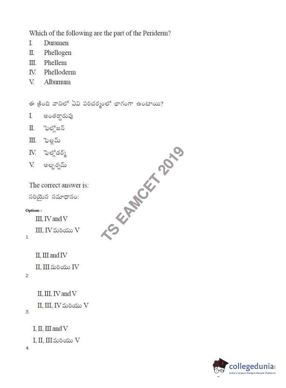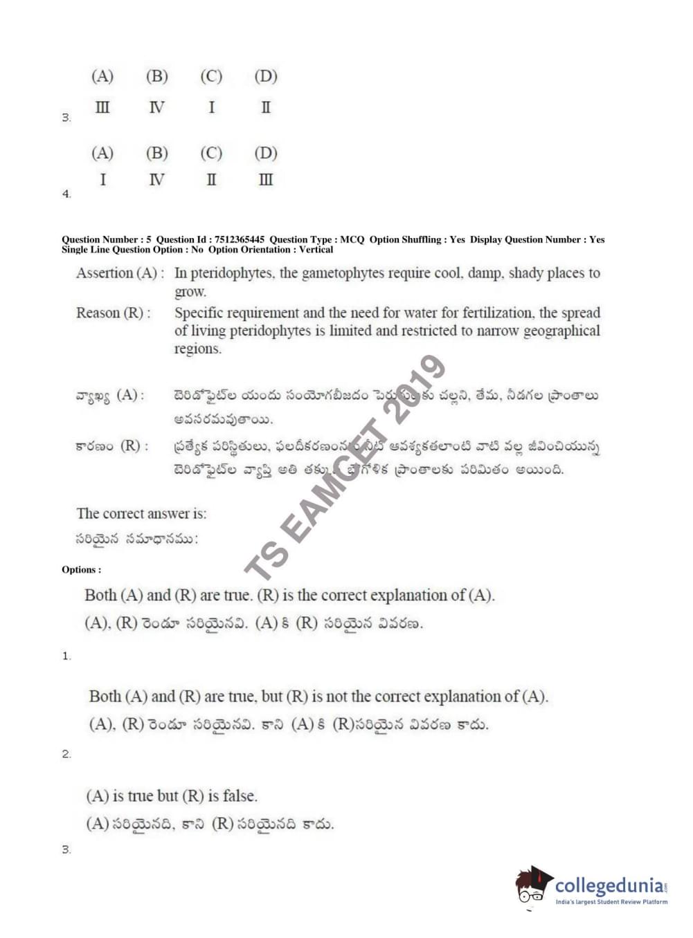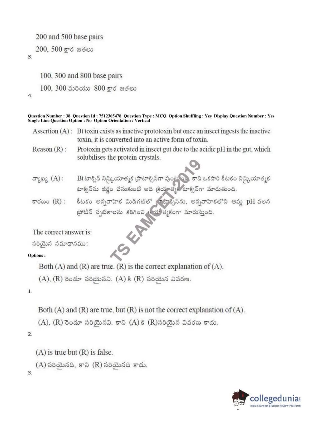 TS EAMCET 2019 Agriculture and Medical Question Paper with Answer Key PDFs Afternoon Session