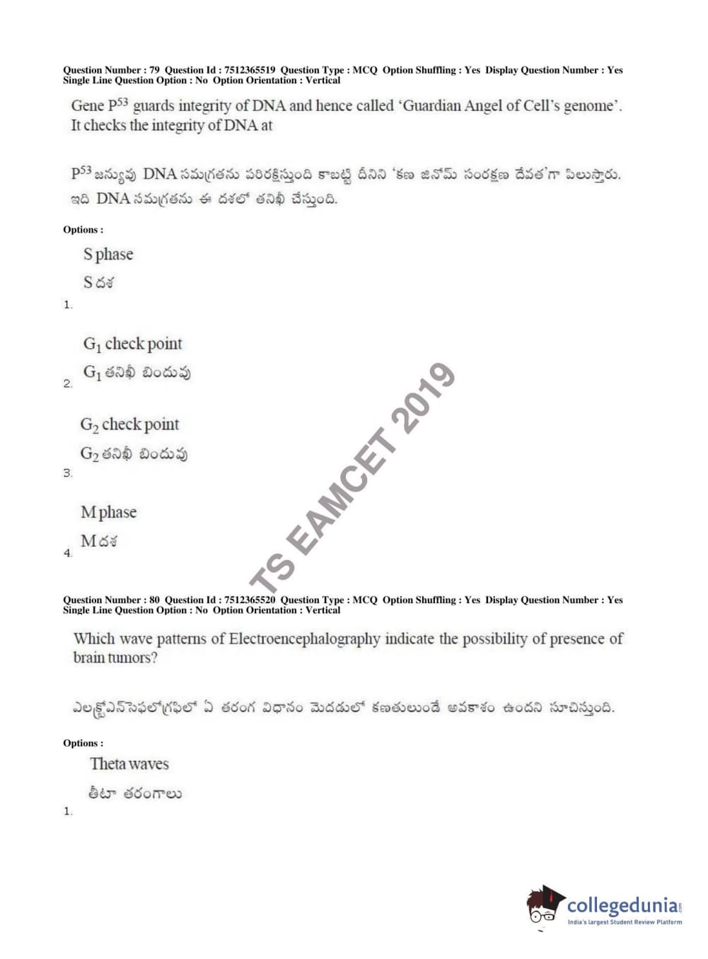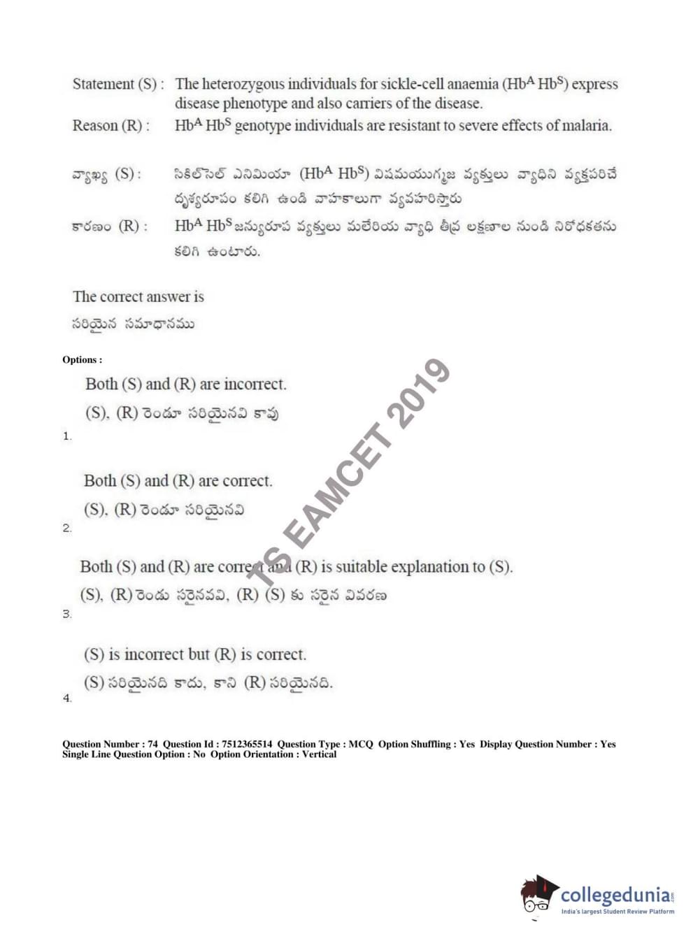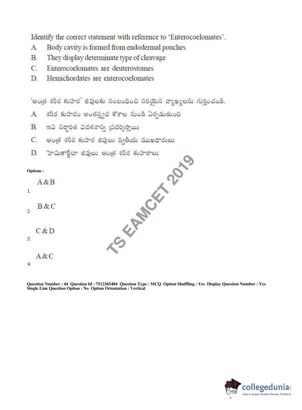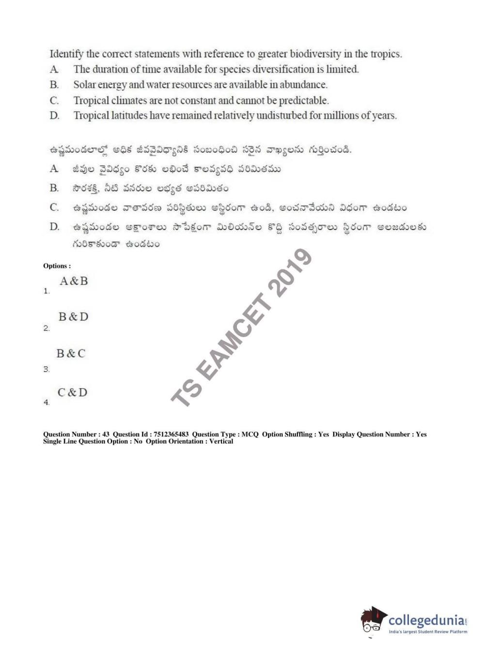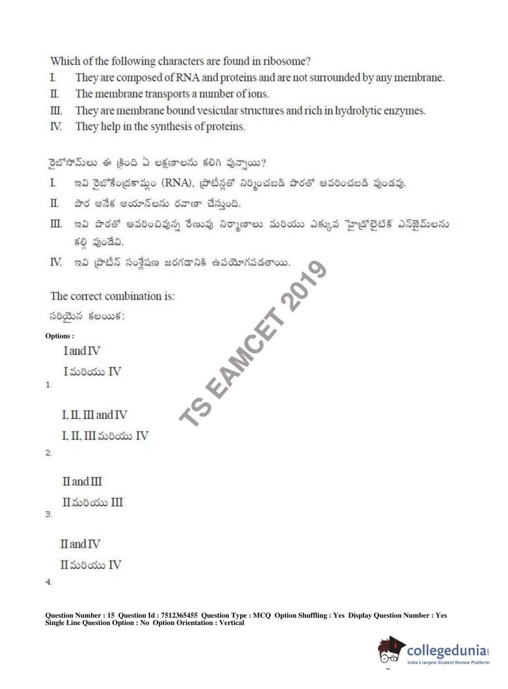 TS EAMCET 2019 Agriculture and Medical Question Paper with Answer Key PDFs Afternoon Session