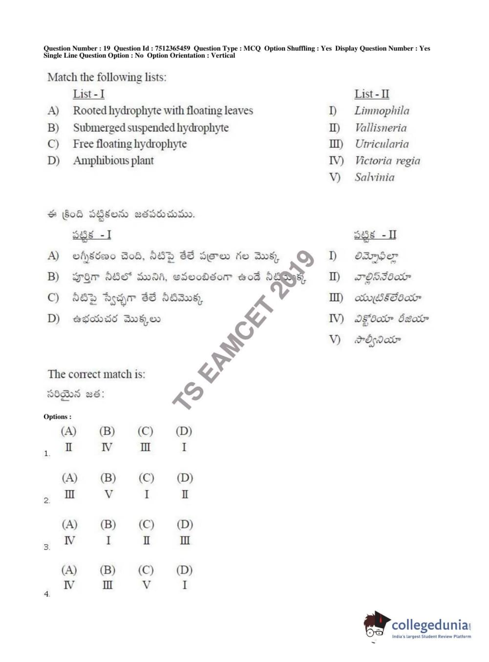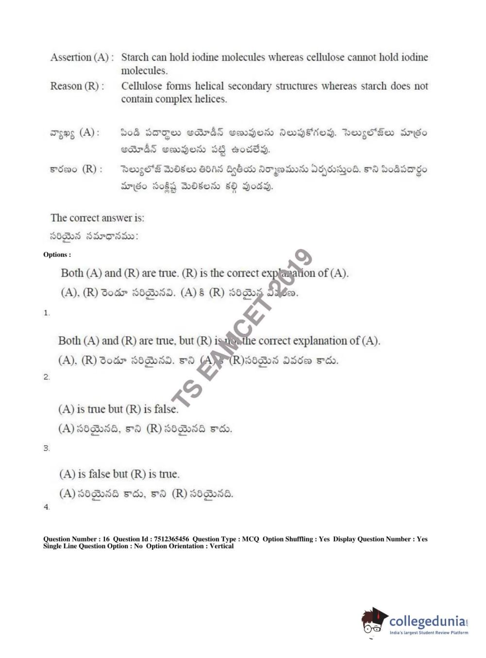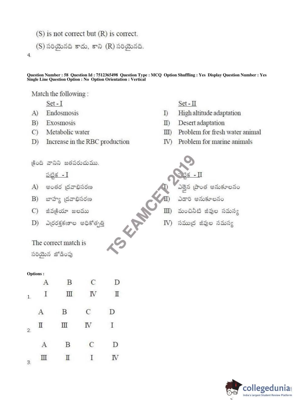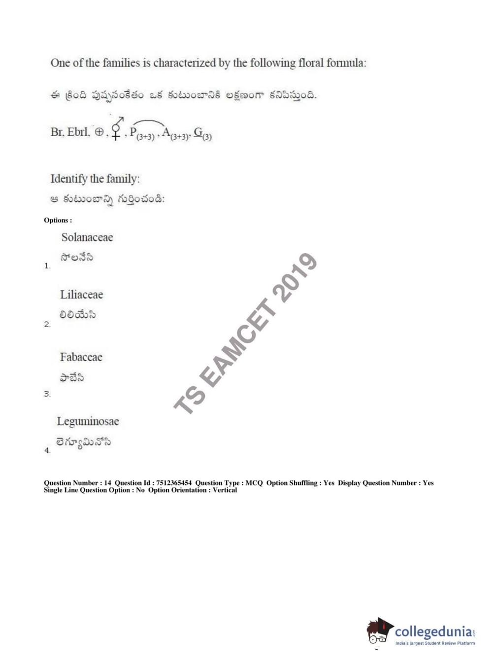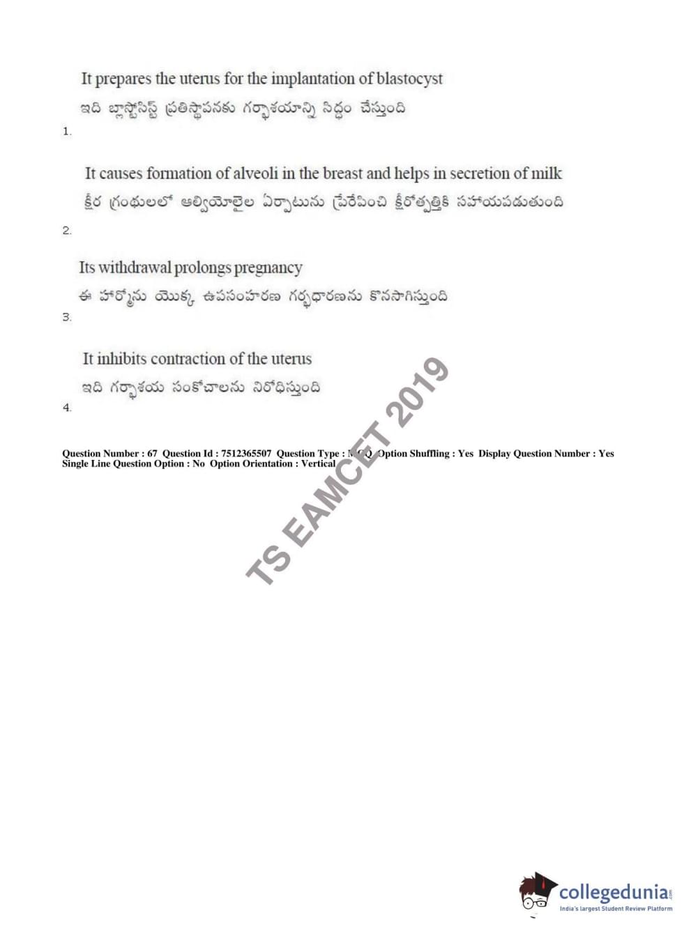 TS EAMCET 2019 Agriculture and Medical Question Paper with Answer Key PDFs Afternoon Session