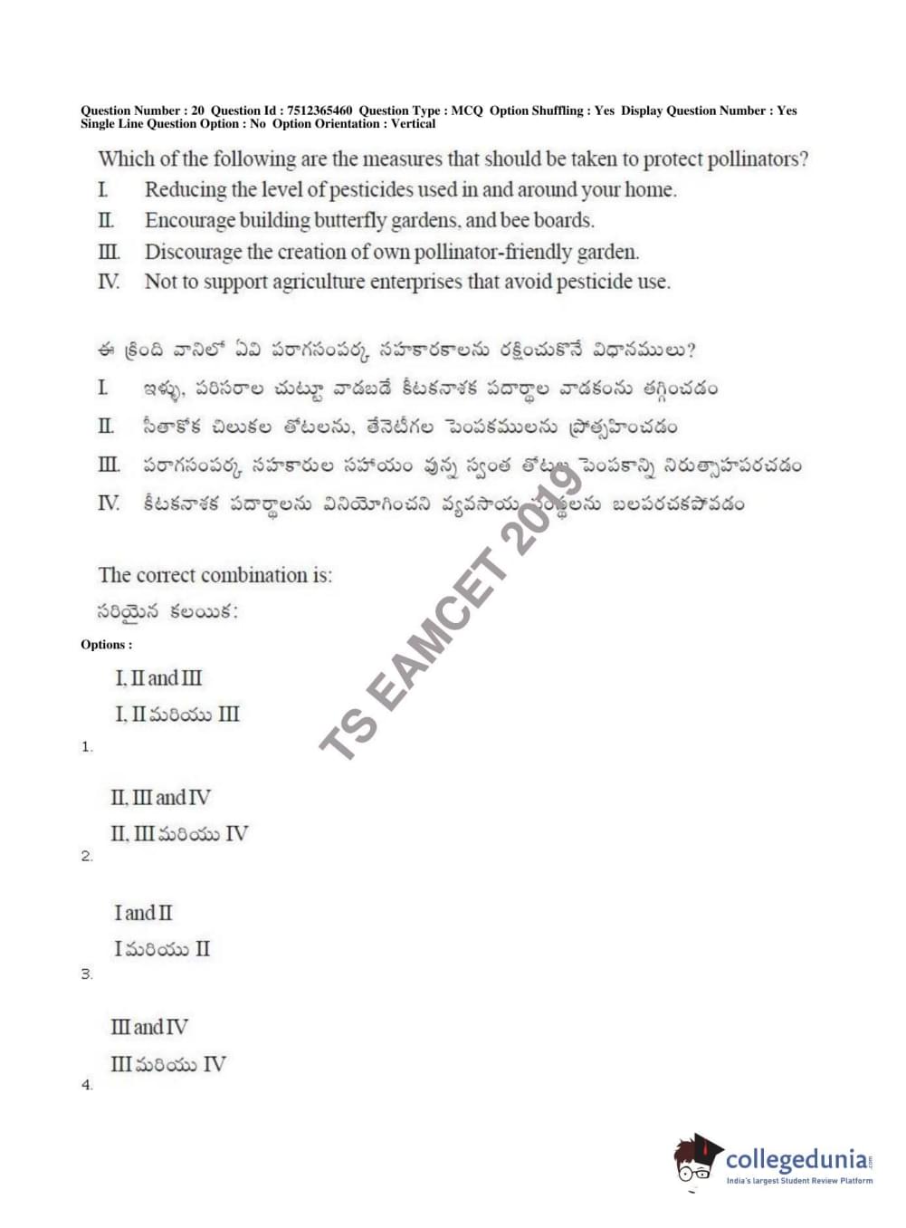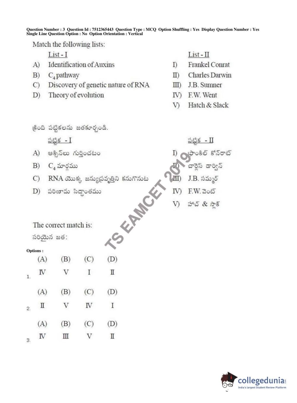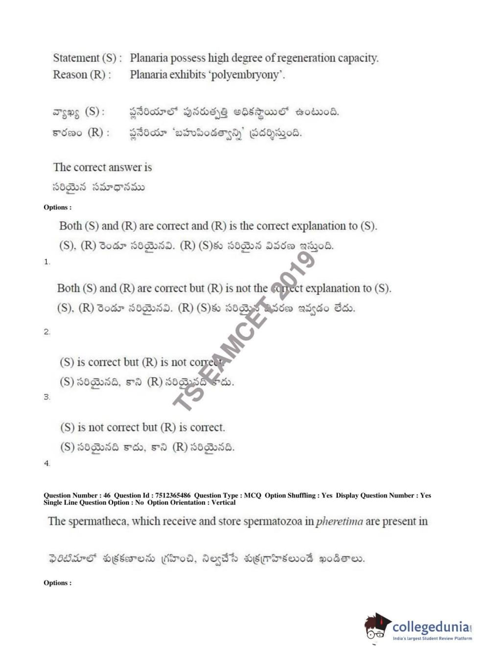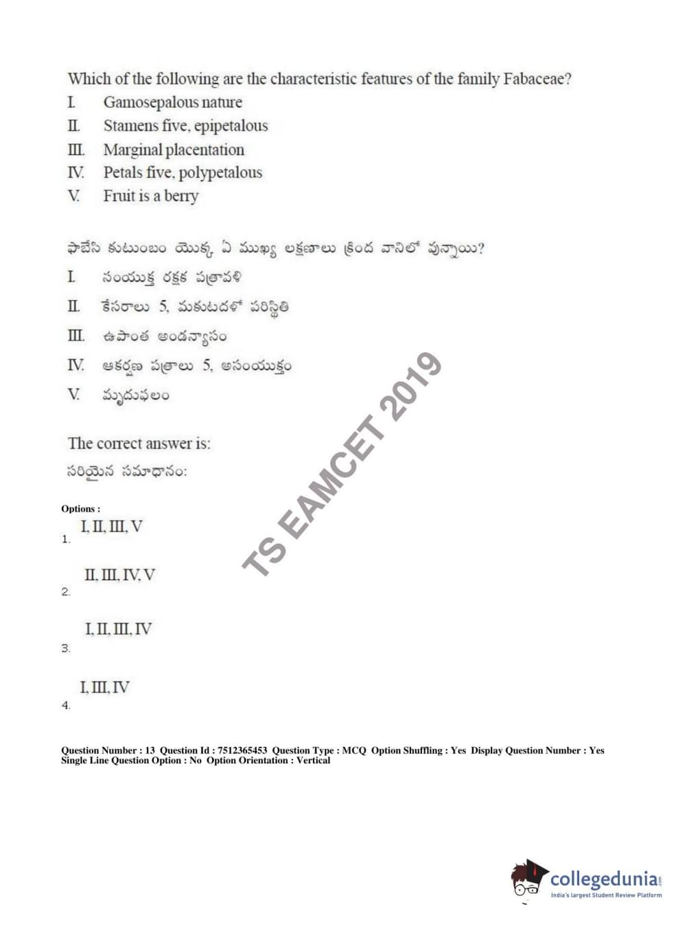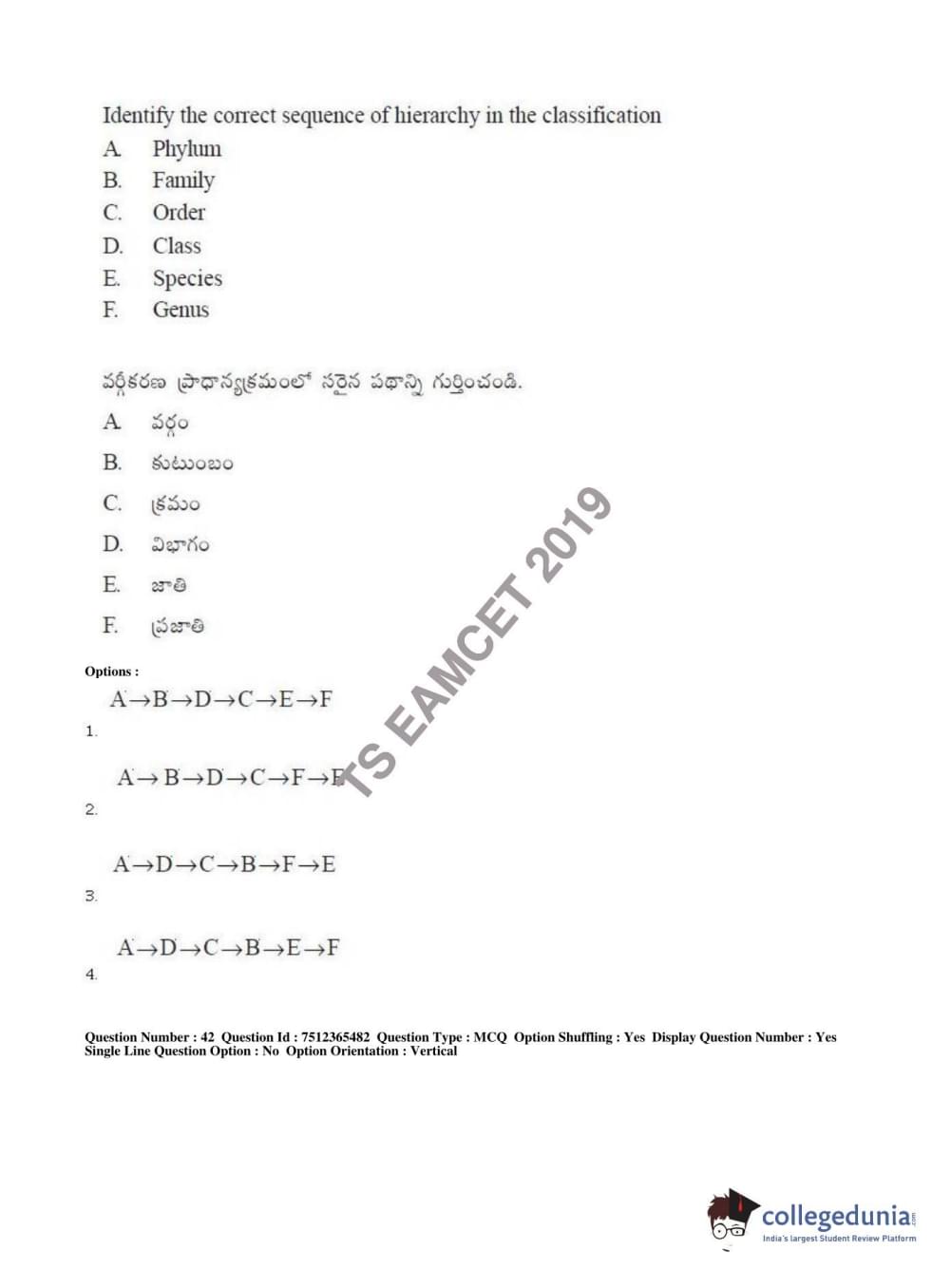 TS EAMCET 2019 Agriculture and Medical Question Paper with Answer Key PDFs Afternoon Session