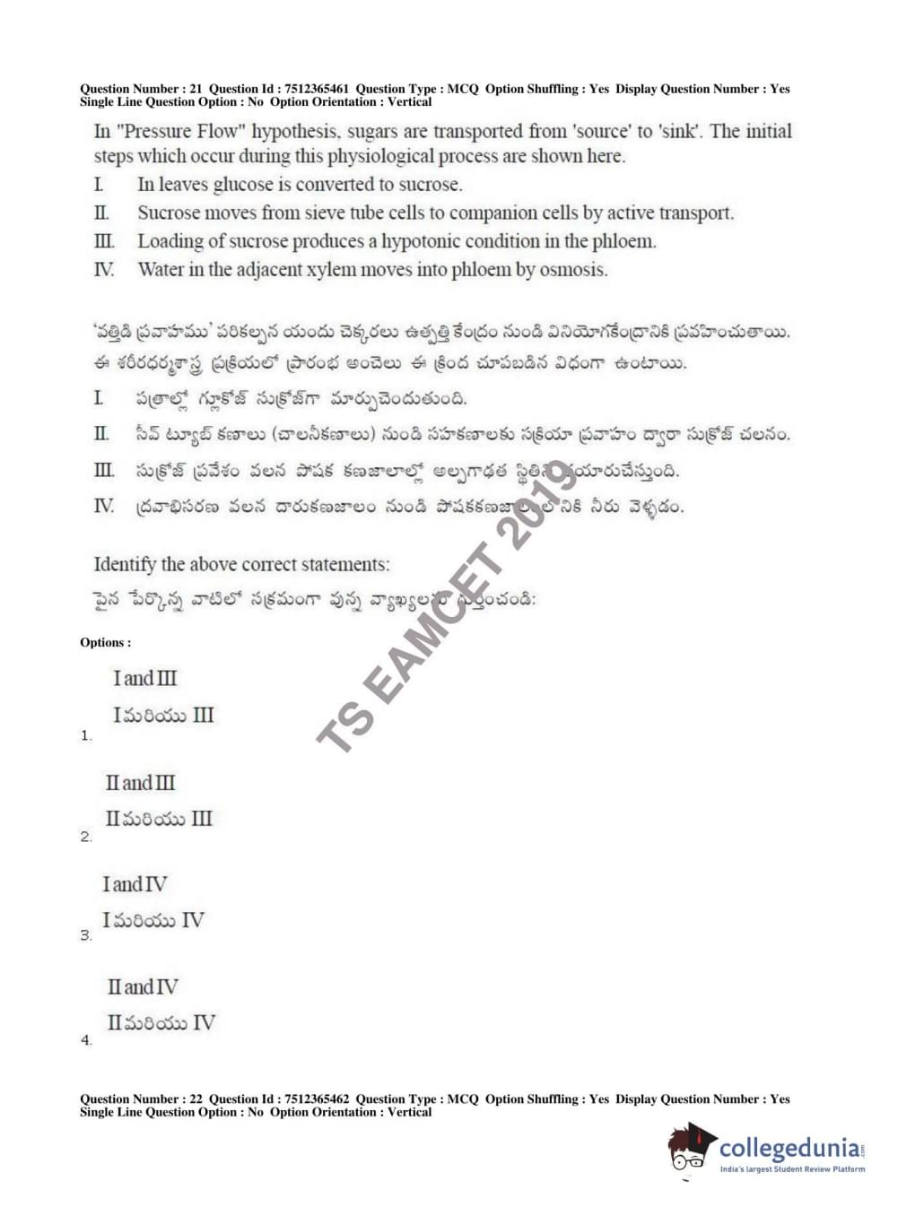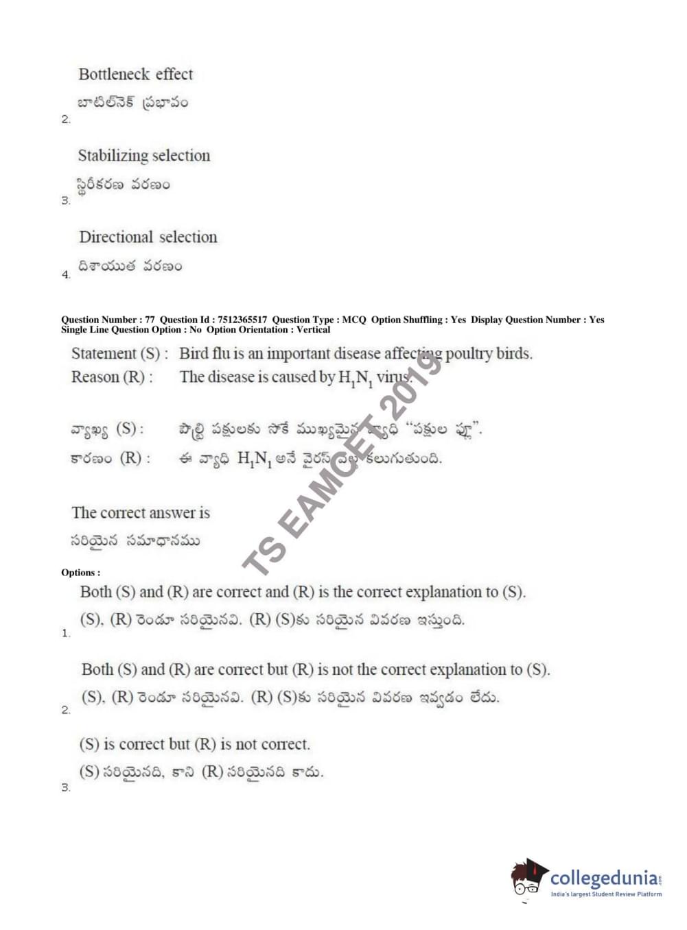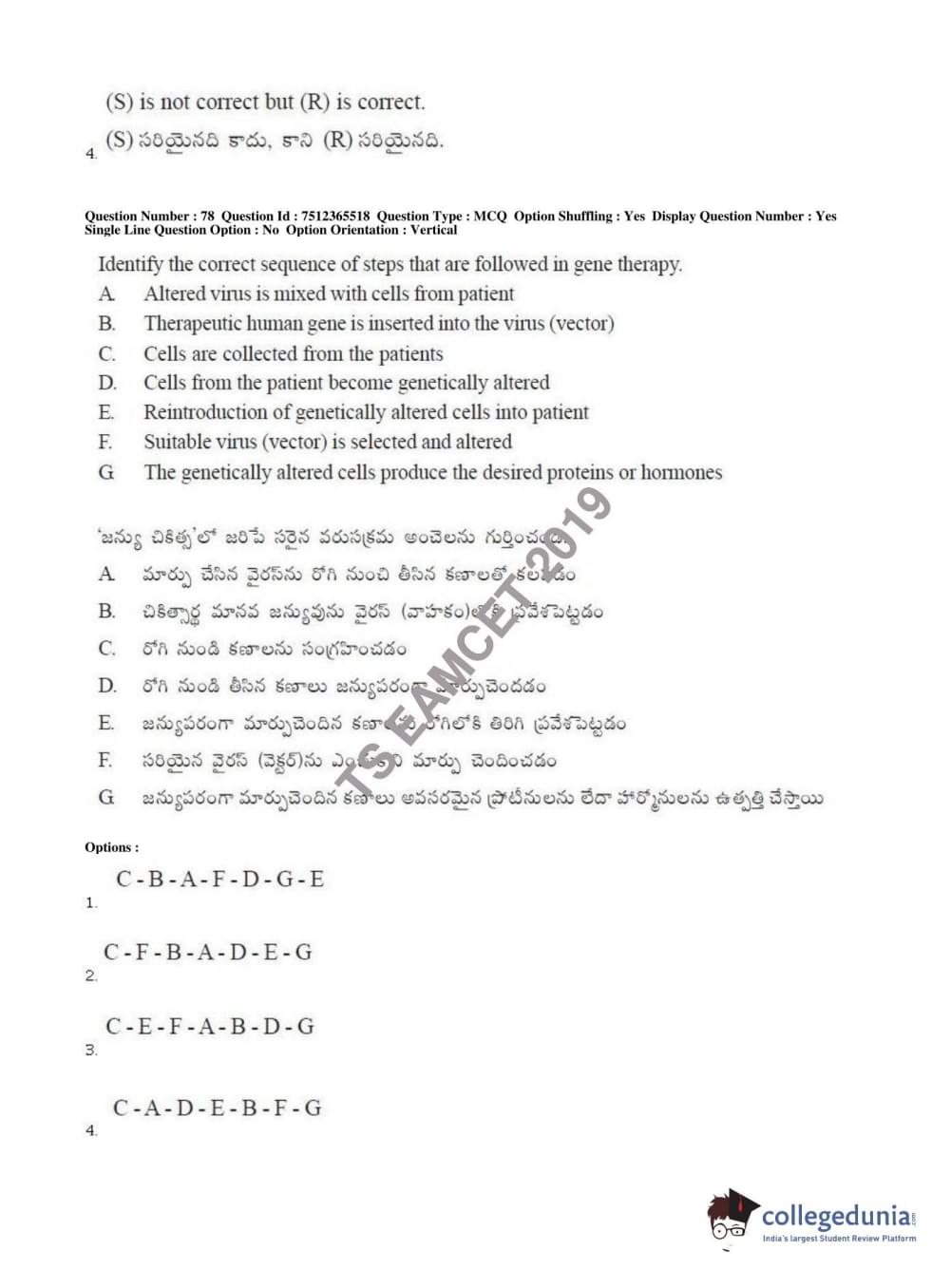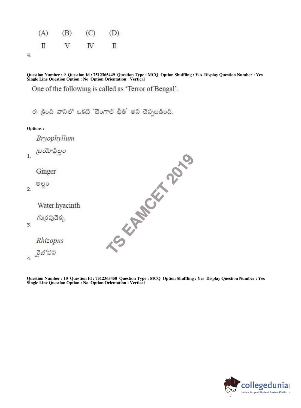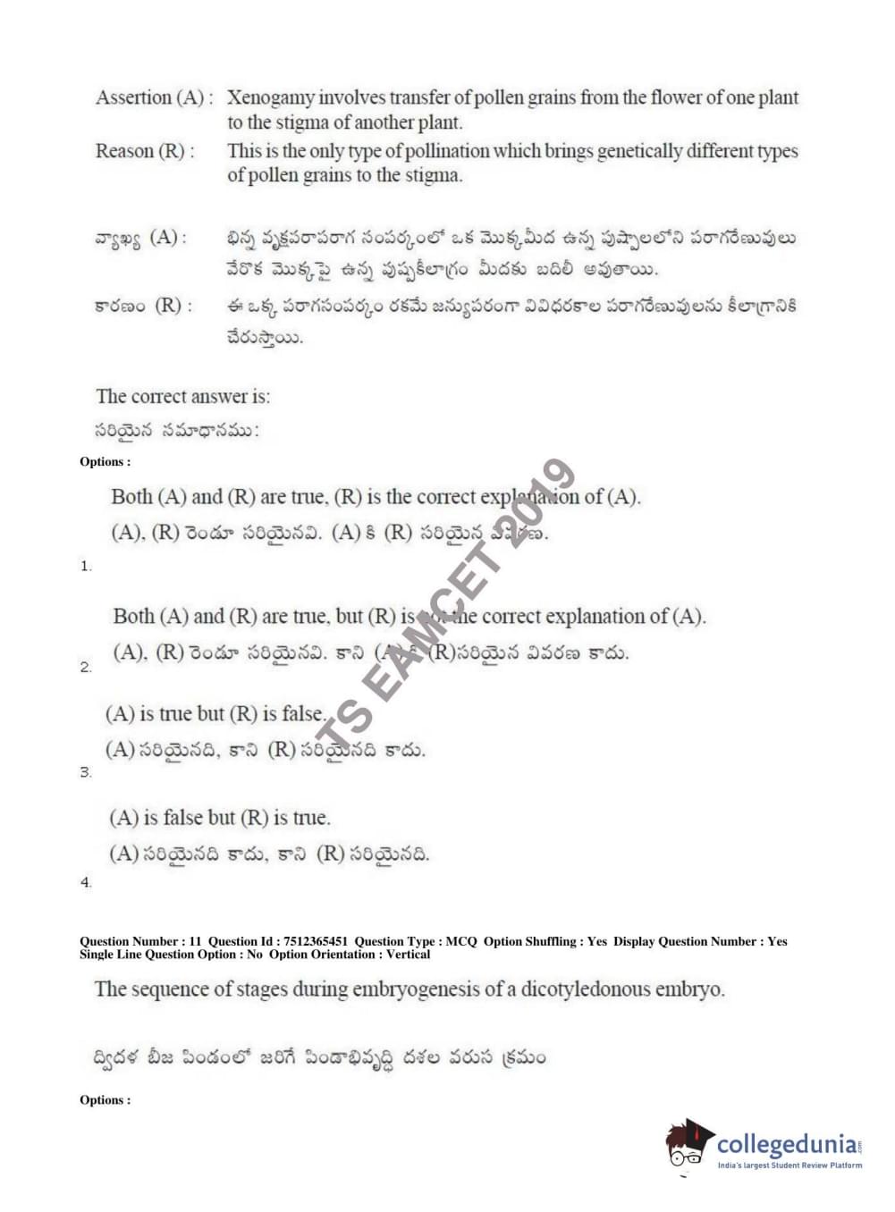 TS EAMCET 2019 Agriculture and Medical Question Paper with Answer Key PDFs Afternoon Session