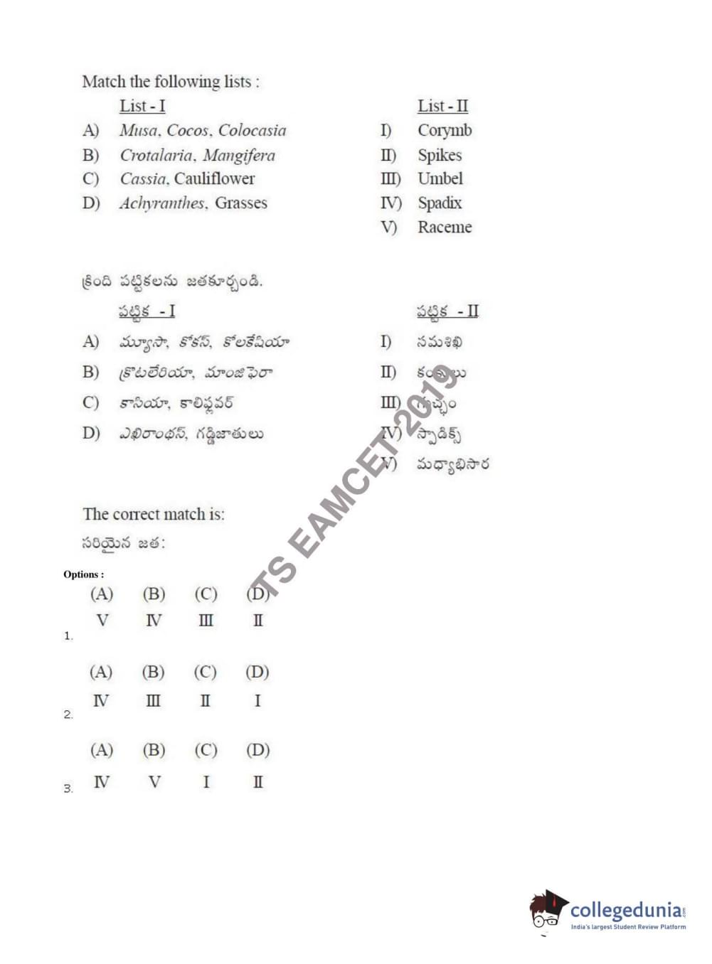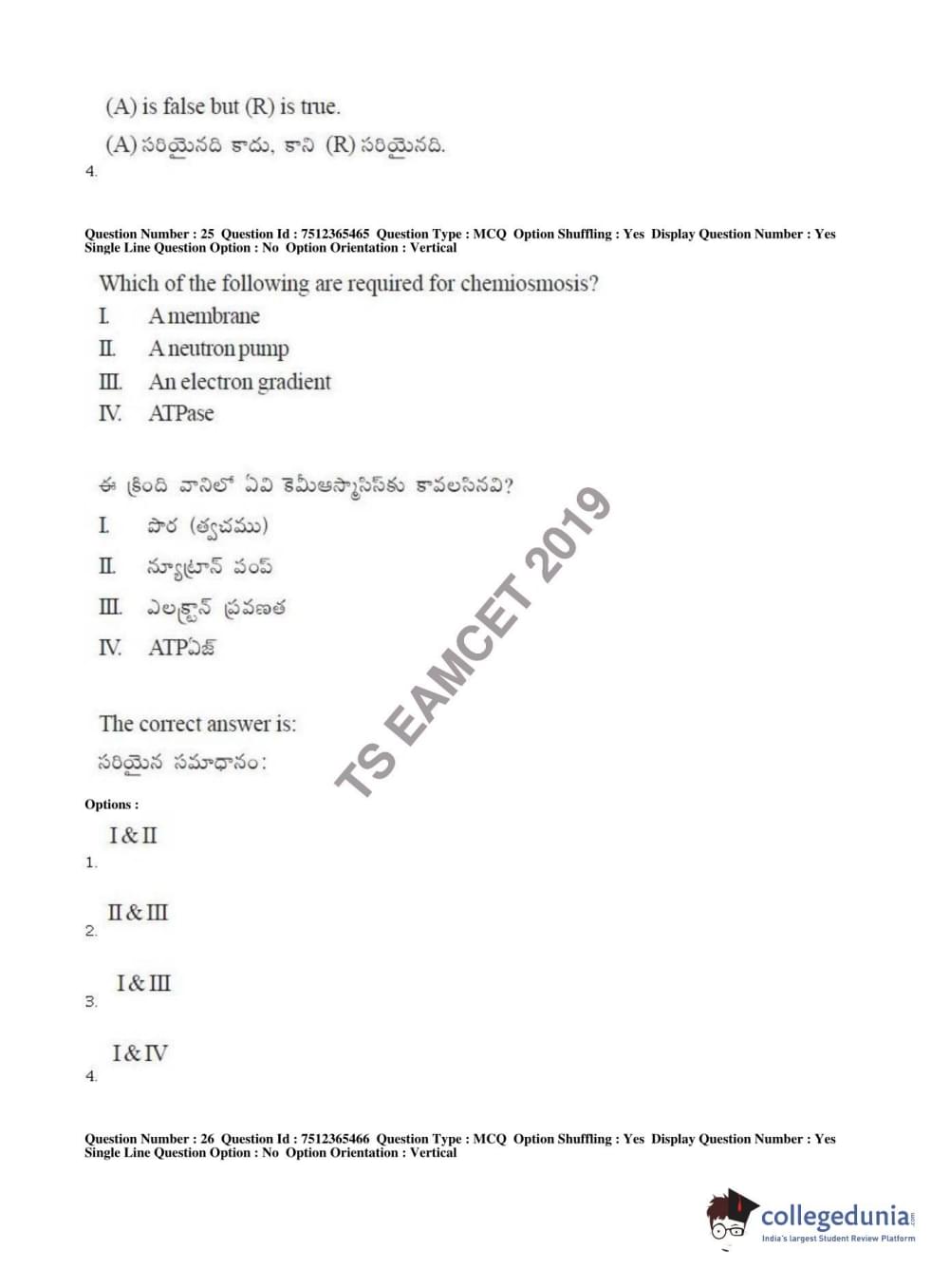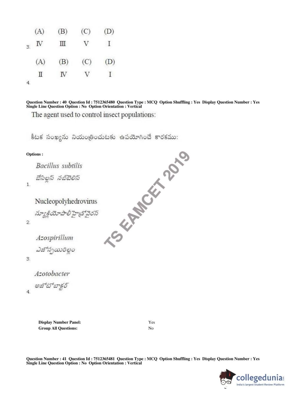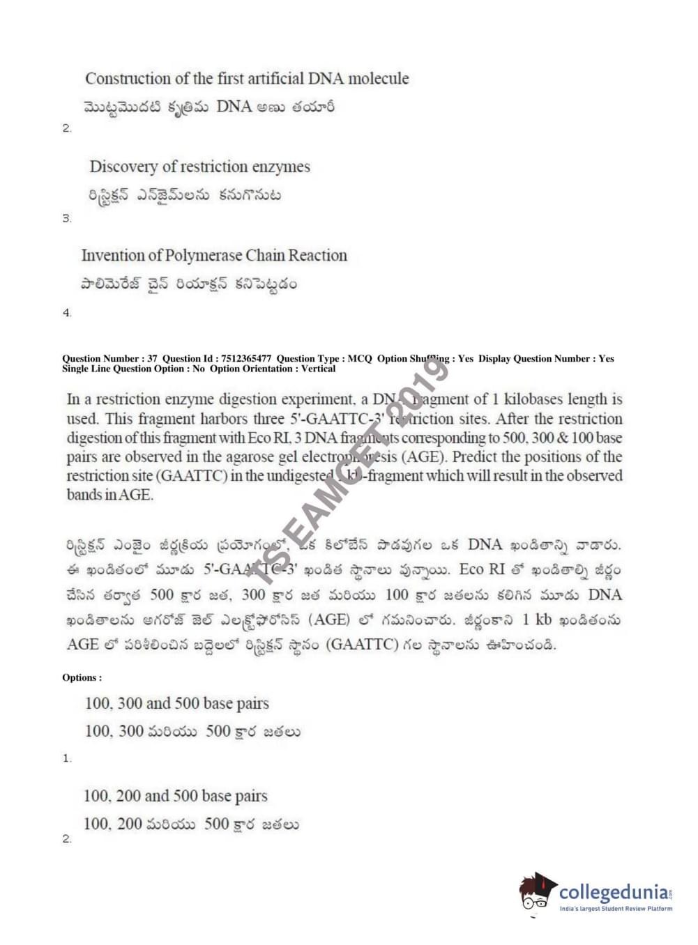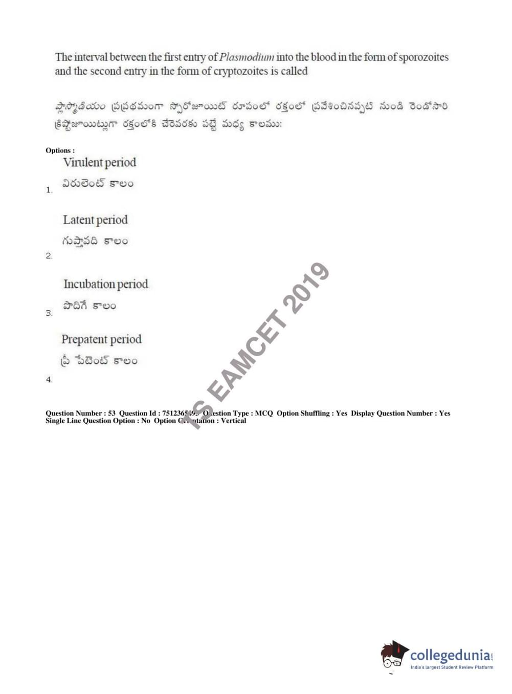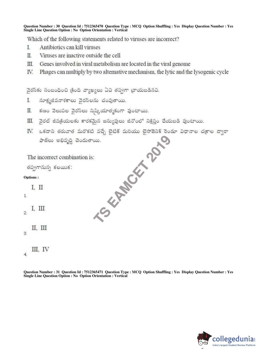 TS EAMCET 2019 Agriculture and Medical Question Paper with Answer Key PDFs Afternoon Session