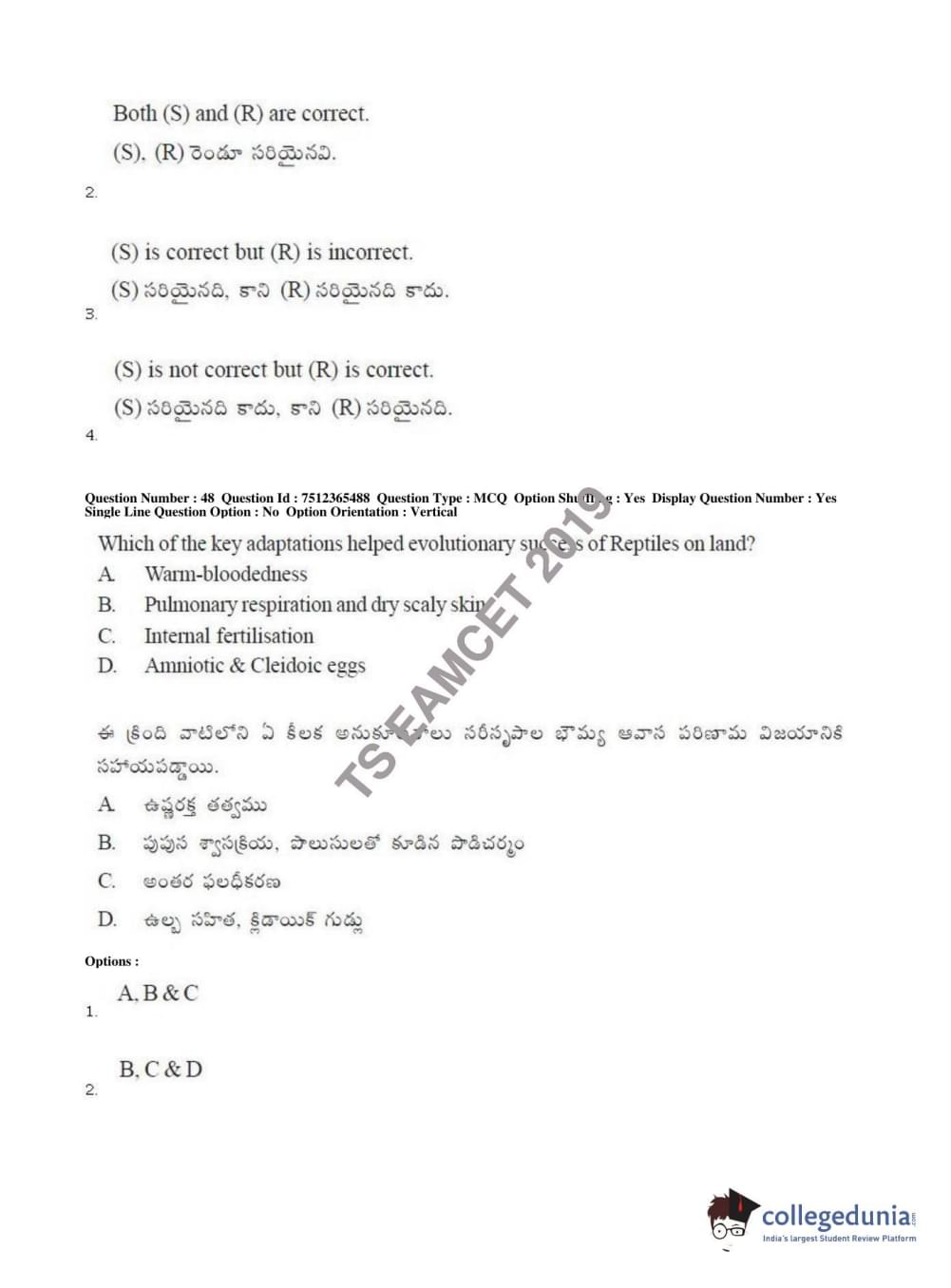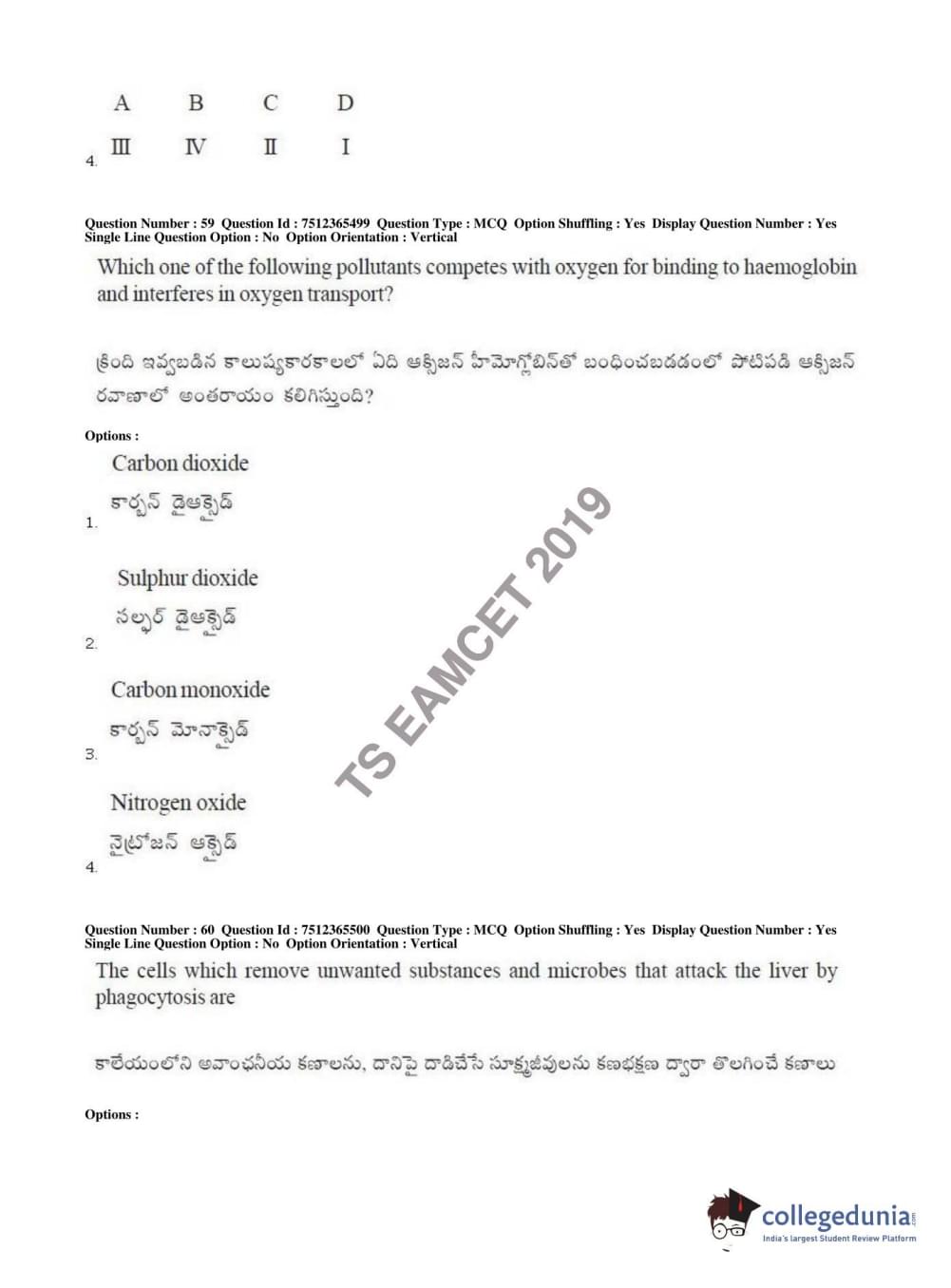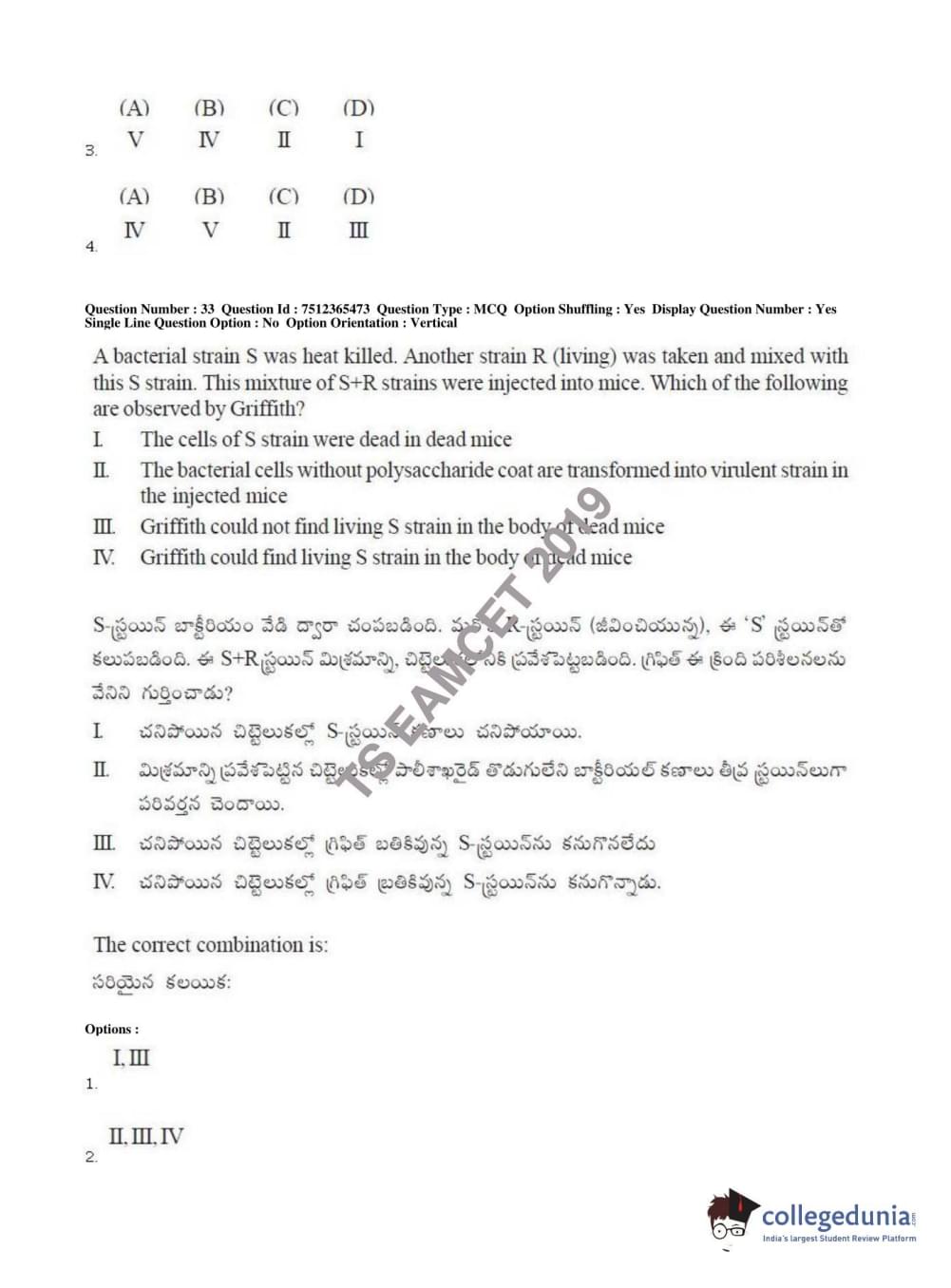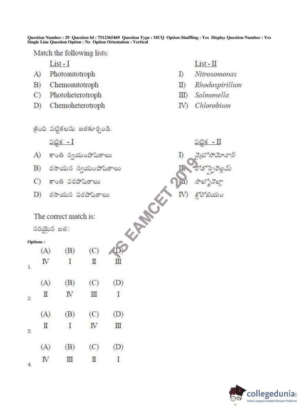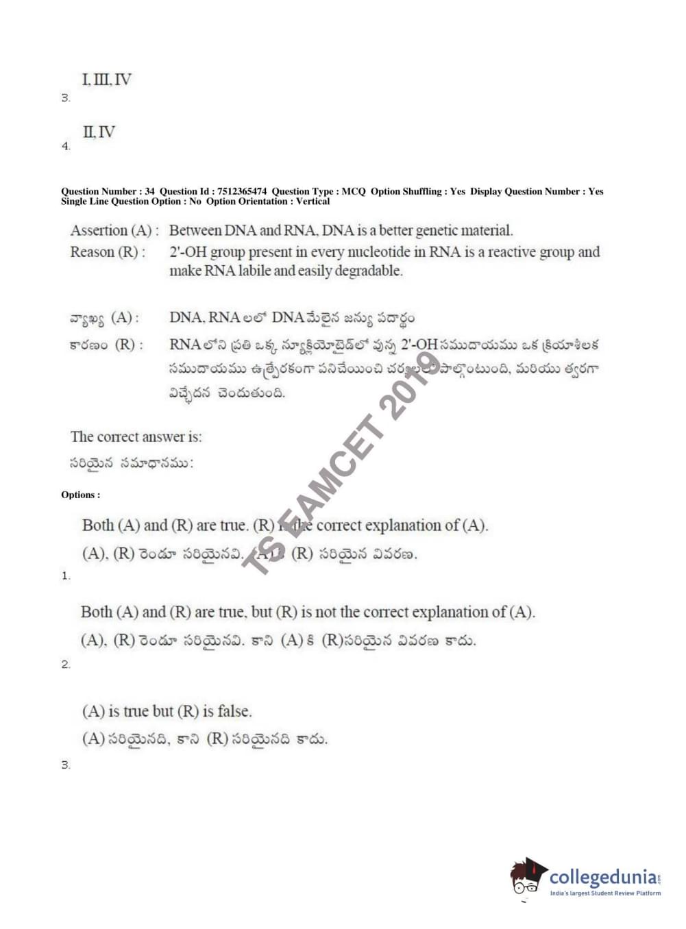 TS EAMCET 2019 Agriculture and Medical Question Paper with Answer Key PDFs Afternoon Session