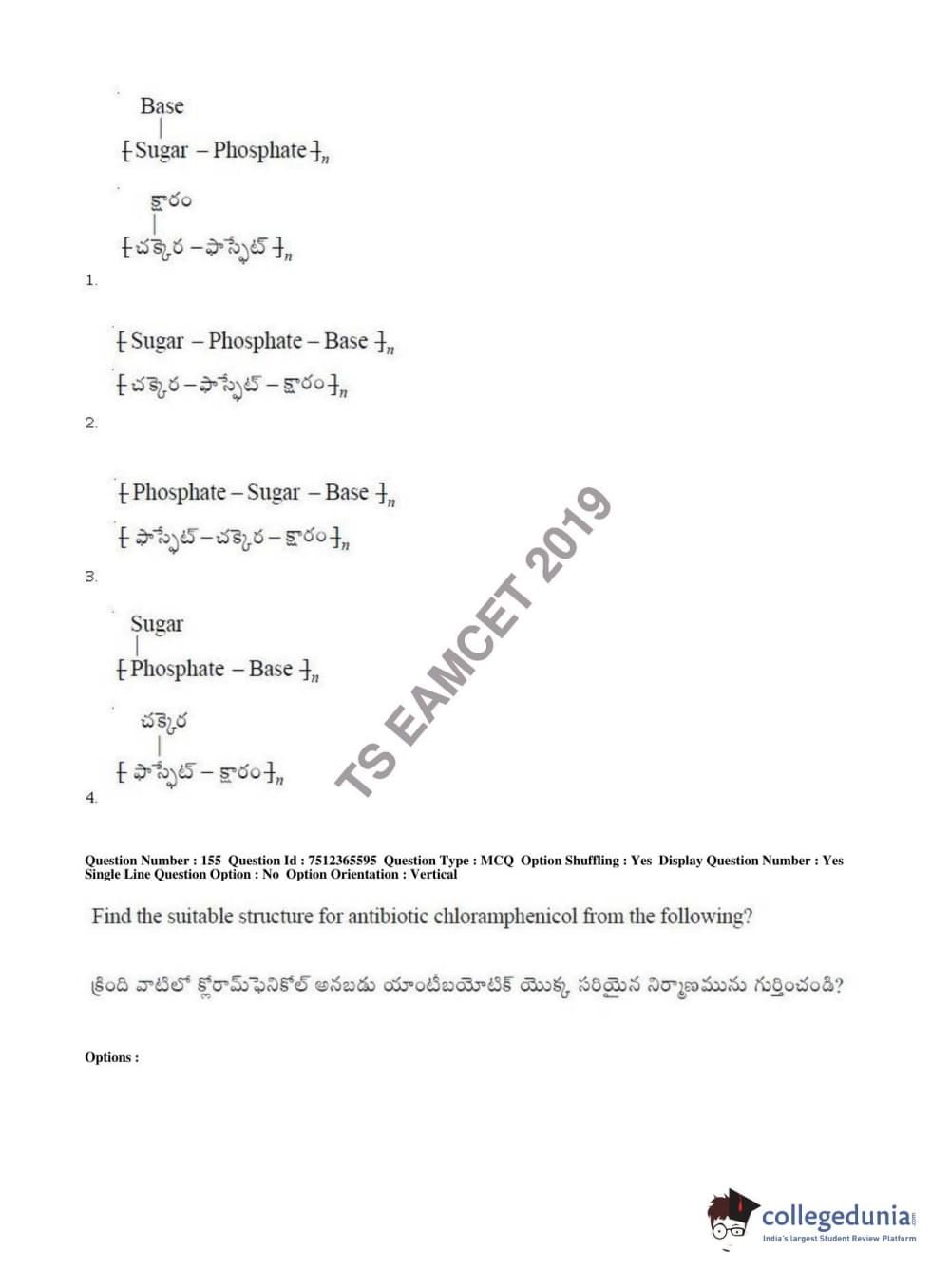 TS EAMCET 2019 Agriculture and Medical Question paper with answer key pdf conducted on May 8 in Afternoon Session 3 PM to 6 PM is available for download. The exam was successfully organized by Jawaharlal Nehru Technological University, Hyderabad (JNTUH). The question paper comprised a total of 160 questions divided among 4 sections.