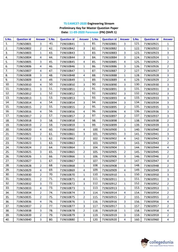 | TS EAMCET 2020 Engineering Question Paper PDF | TS EAMCET 2020 Engineering Answer Key PDF |