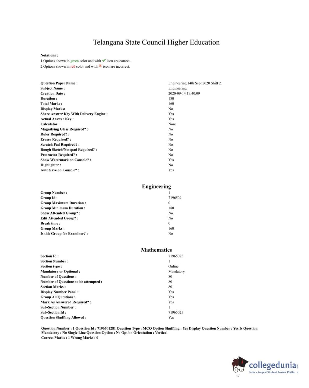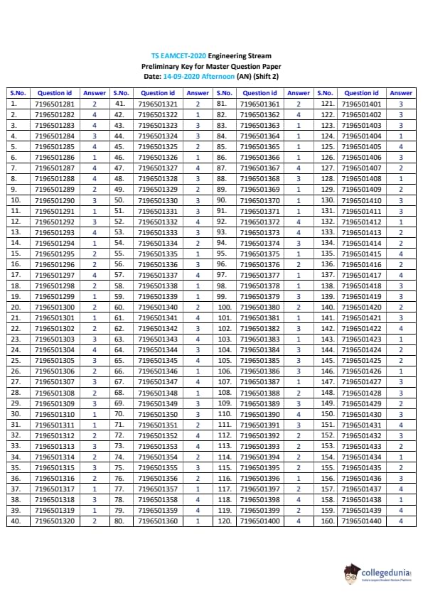 | TS EAMCET 2020 Engineering Question Paper PDF | TS EAMCET 2020 Engineering Answer Key PDF |