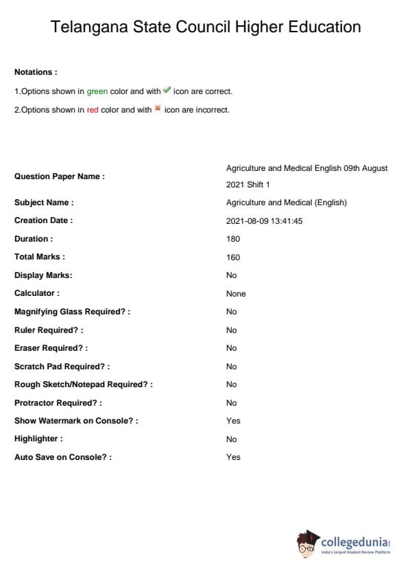 TS EAMCET 2021 Agriculture and Medical Question paper with answer key pdf conducted on August 9 in Forenoon Session 9 AM to 12 PM is available for download. The exam was successfully organized by Jawaharlal Nehru Technological University, Hyderabad (JNTUH). The question paper comprised a total of 160 questions divided among 4 sections.