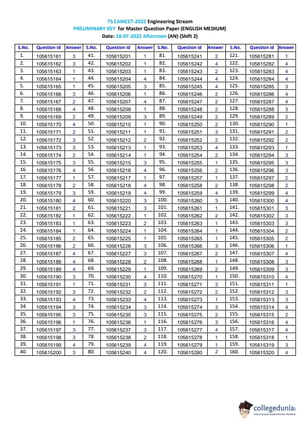 | TS EAMCET 2022 Question Paper | TS EAMCET 2022 Answer Key |