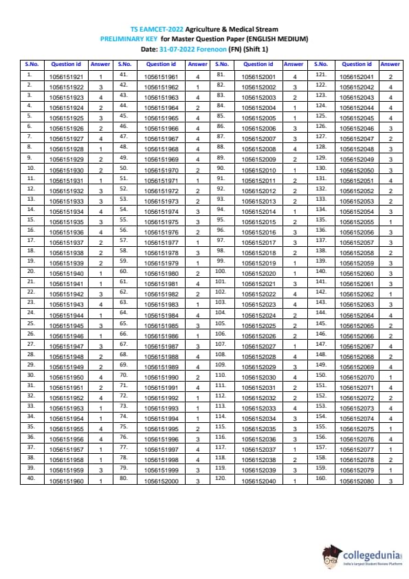 | TS EAMCET 2022 Question Paper | TS EAMCET 2022 Answer Key |
