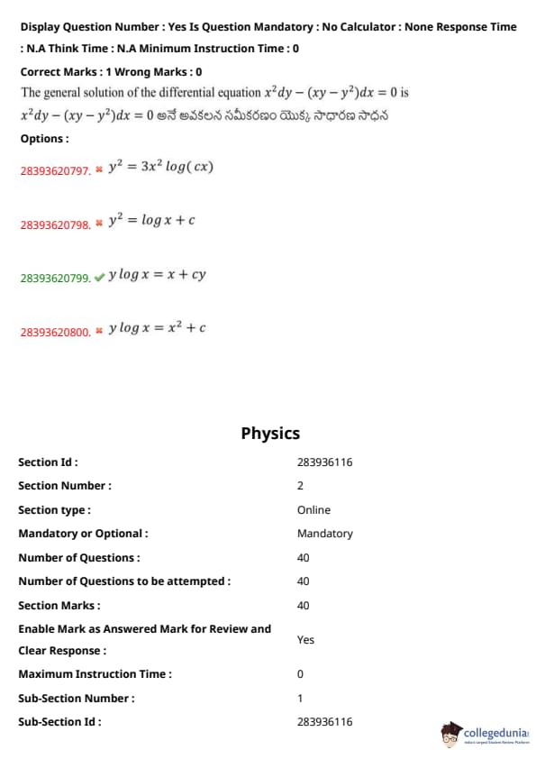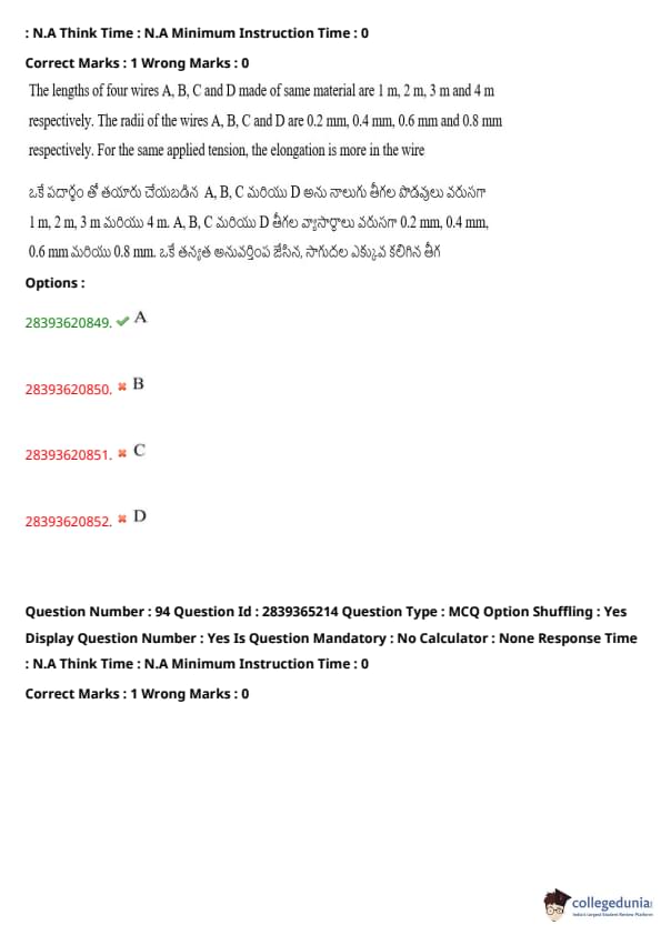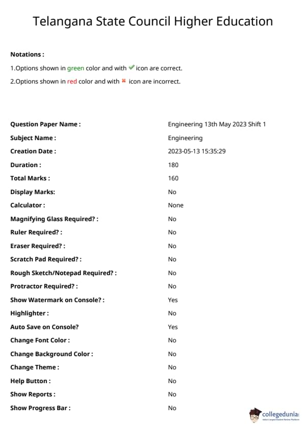 TS EAMCET 2023 Question Paper May 13 Shift 1 PDF is available here for download. TS EAMCET 2023 Question Paper consists of 160 questions carrying 1 mark each. TS EAMCET 2023 Question Paper May 13 Shift 1 PDF for MPC includes three subjects, Physics, Chemistry and Mathematics. The Physics and Chemistry section of the paper includes 40 questions each while the Mathematics section includes a total of 80 questions.